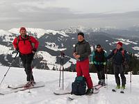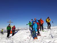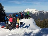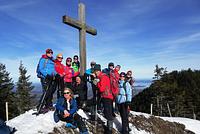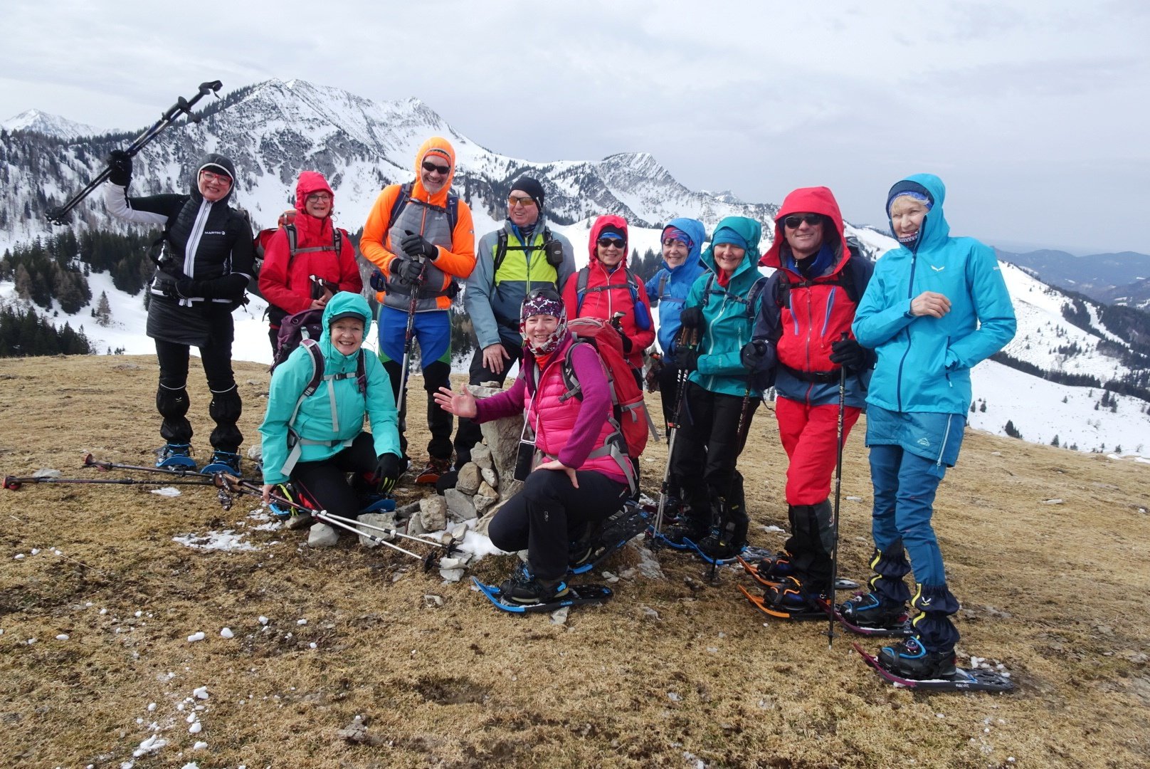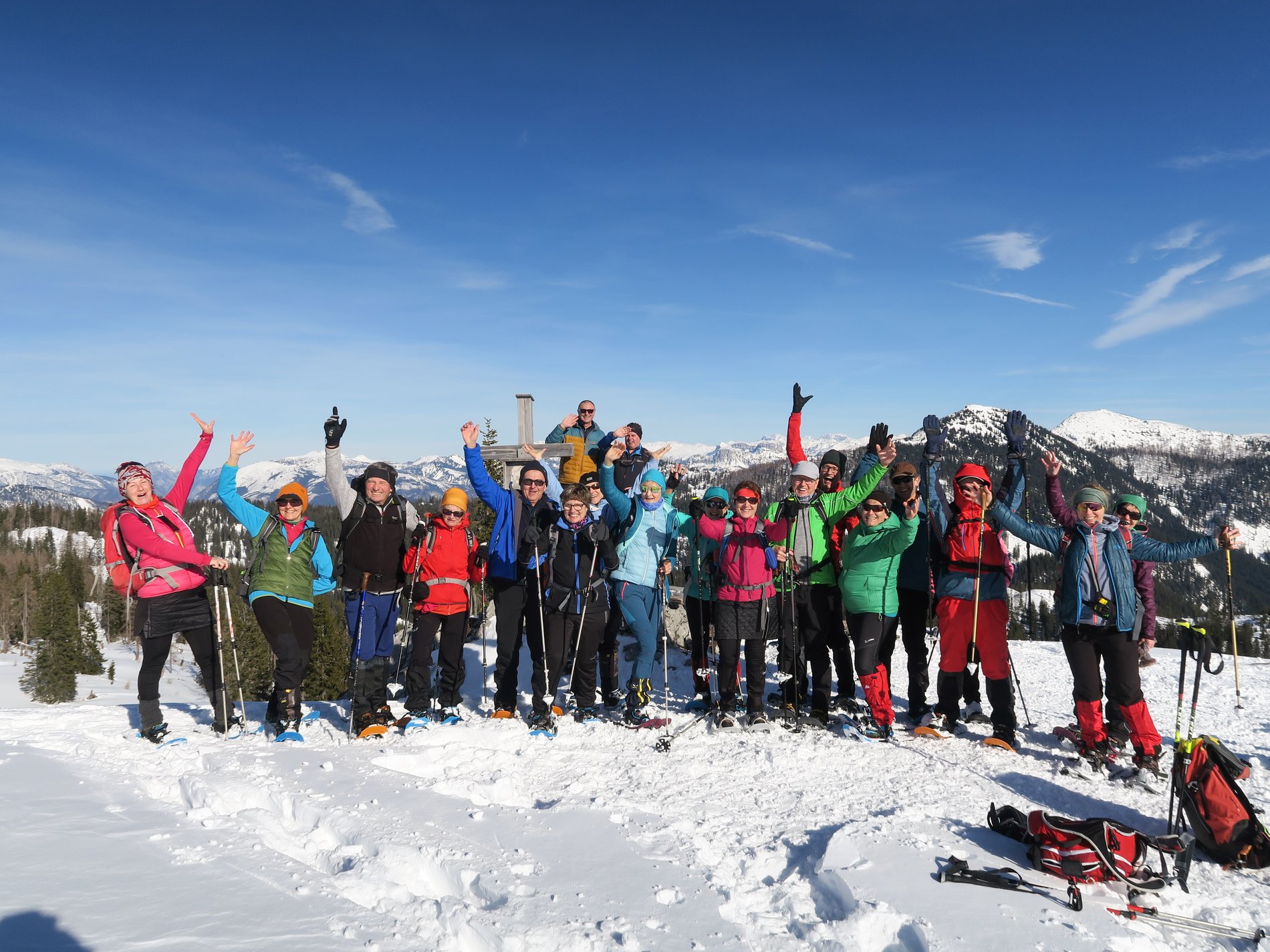 Aufgeteilt in drei Gruppen, wanderten wir erst in frisch verschneitem Winterwald, später dann über freie Hänge hinauf zum höchsten Punkt. Und hier zeigte sich, dass sich so viele nicht irren können. Bei strahlend blauem Himmel bot sich ein einzigartiges 360-Grad-Panorama, wie es seinesgleichen sucht. Wie eine Einladung für weitere schöne Touren grüßten aus der Nähe Dachstein und Tennengebirge. Nach wie üblich kurzweiligem Abstieg freuten sich alle, an einem ganz besonderen Punkt in den Bergen gewesen zu sein.