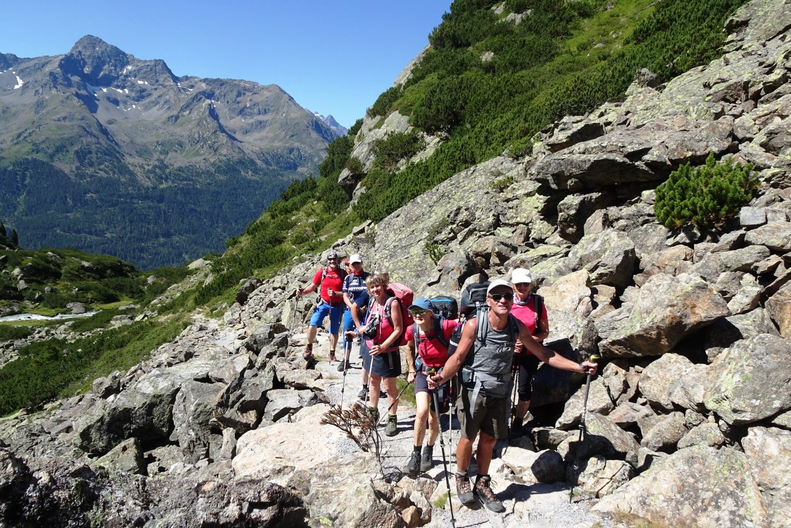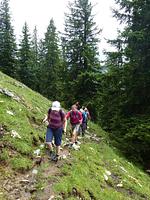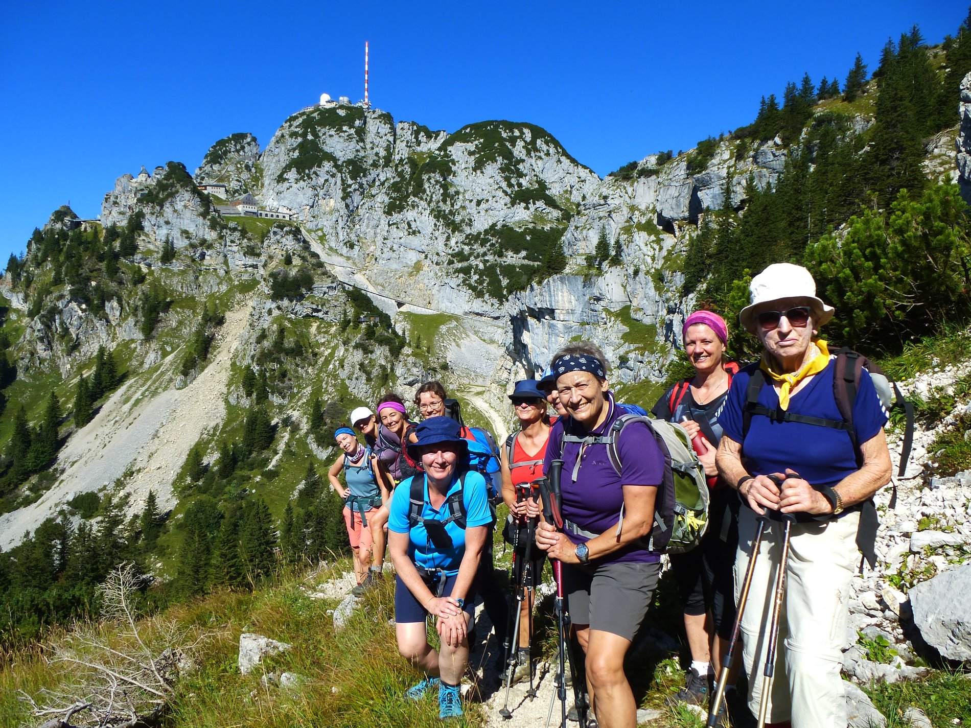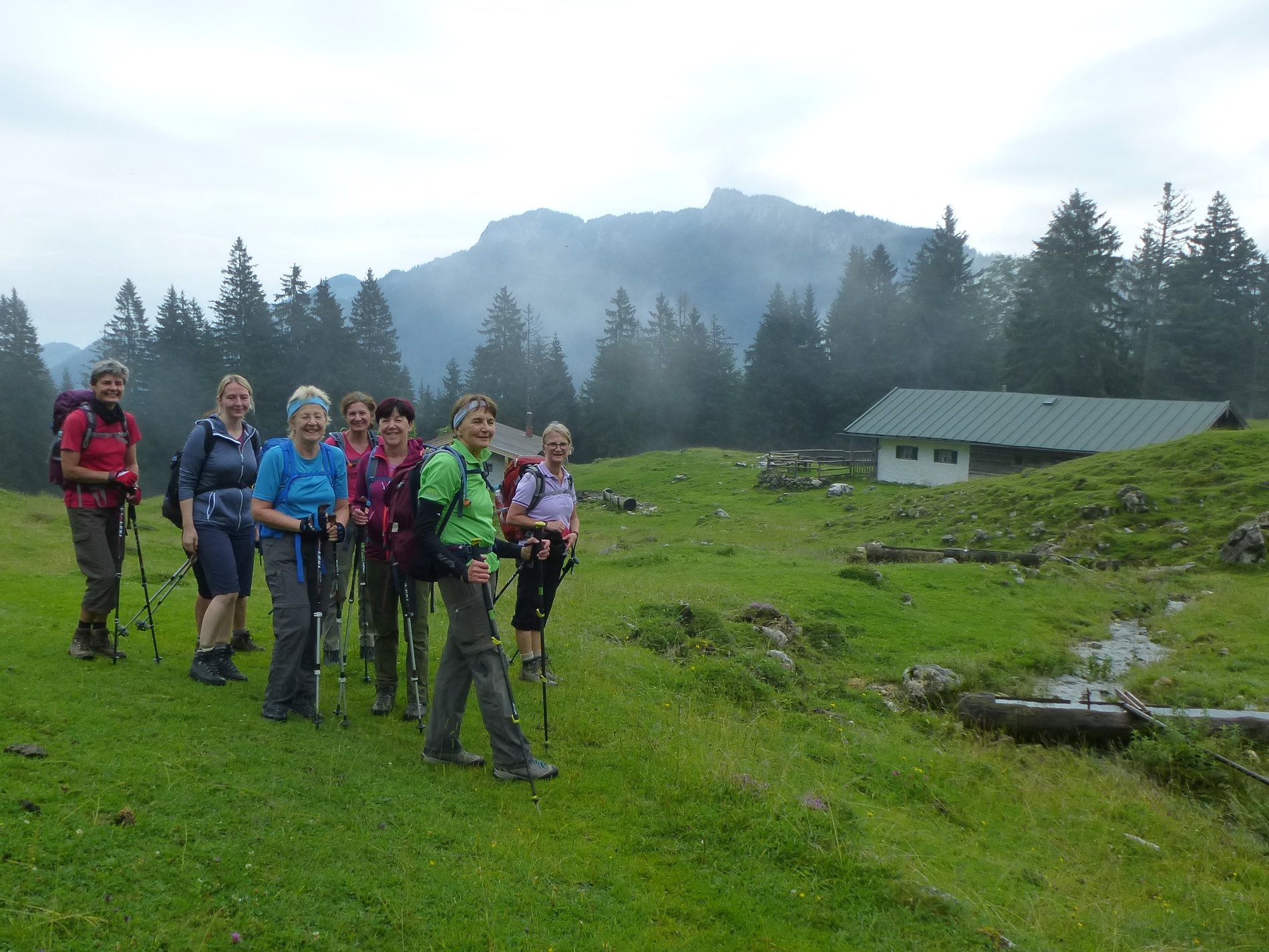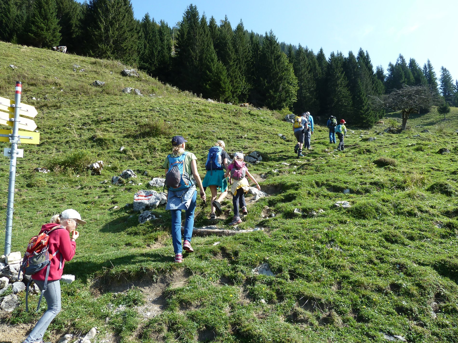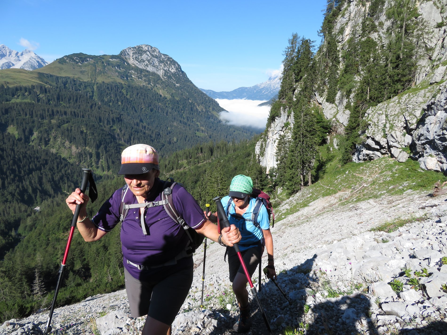 Nach dem Abstieg zum Schuhflickersee wurde der Hias-Wallner-Steig in Angriff genommen. Es ging wieder bergauf auf einen schmalen Steig, der den Schuhflicker mit dem 2180 Meter hohen Hochegg verbindet. Die Querung der steilen Grasflanke des Hochegg, ebenso der steil abfallende, stellenweise schmale erste Gratteil verlangte hohe Konzentration, einige wackelige Seilversicherungen boten eher moralische Hilfe als echte Unterstützung. Danach wartete ein langer Abstieg durch Wälder und über Wiesen auf die Bergwanderer, ehe die idyllisch gelegene Steiner Hochalm mit prächtiger Aussicht auf einer Höhe von 1550 Metern endlich die langersehnte Pause bot. Einen von der Hüttenwirtin gratis angebotenen selbstgemachten Zirbenschnaps lehnte natürlich keiner ab.