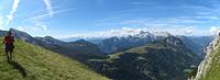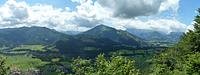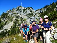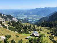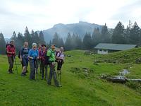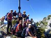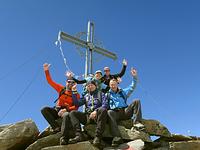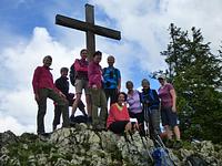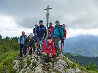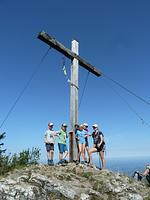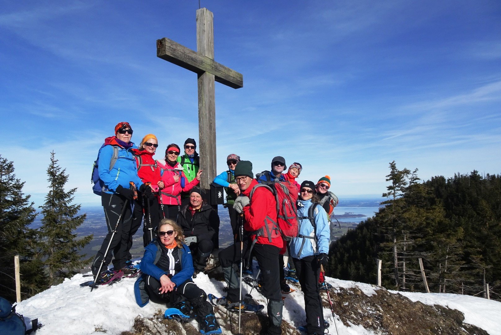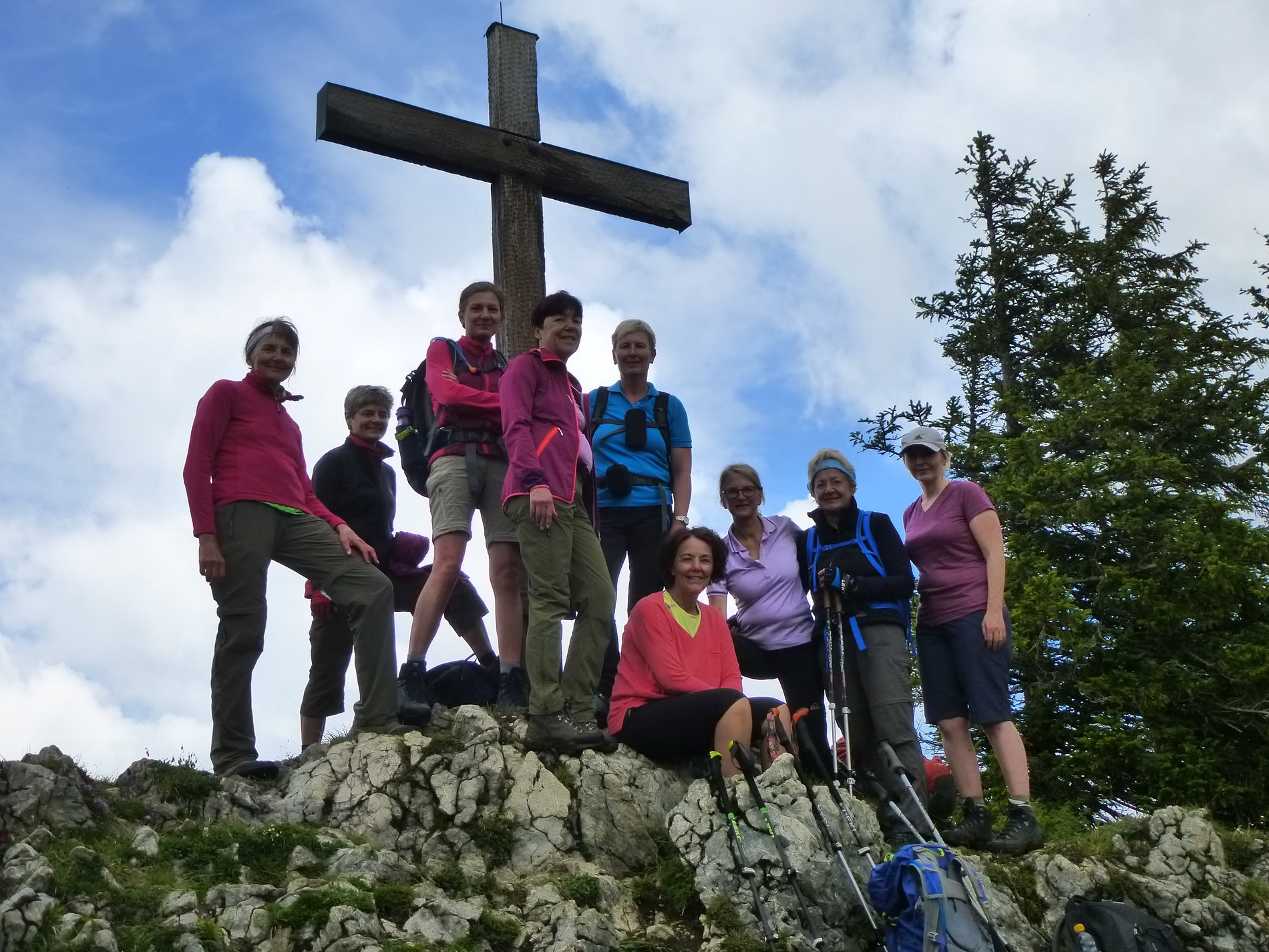 Ein Teilnehmer durfte den Gipfel gleich zweimal besteigen, einmal ohne und einmal mit Wanderstöcke! Wir suchten uns ein schattiges Plätzchen und genossen während der Brotzeit das prächtige Bergpanorama mit Seeblick (Simssee) im Norden bis hin zu den schneebedeckten Gipfeln des Alpenhauptkammes im Süden. Nur die Aussicht auf eine Einkehr in der Wagneralm lies uns diesen Platz räumen.