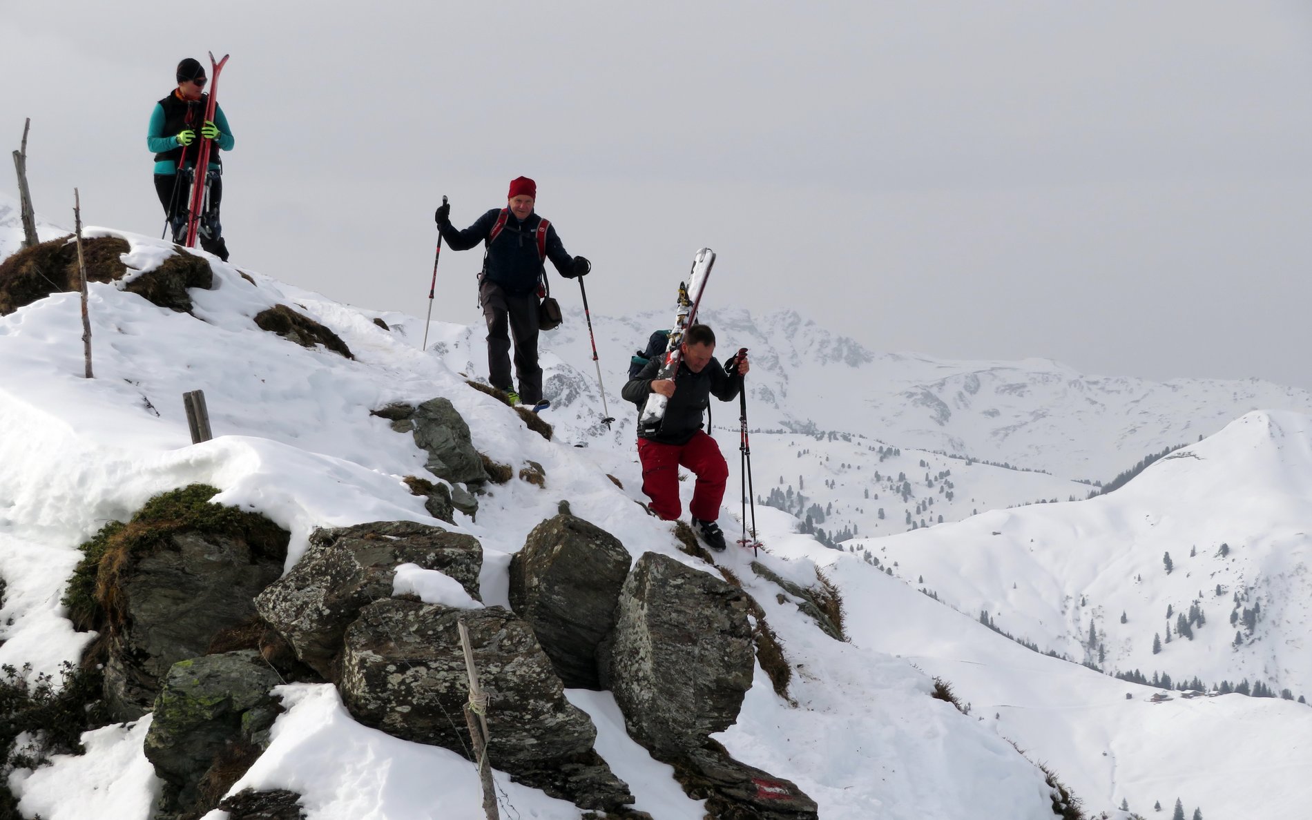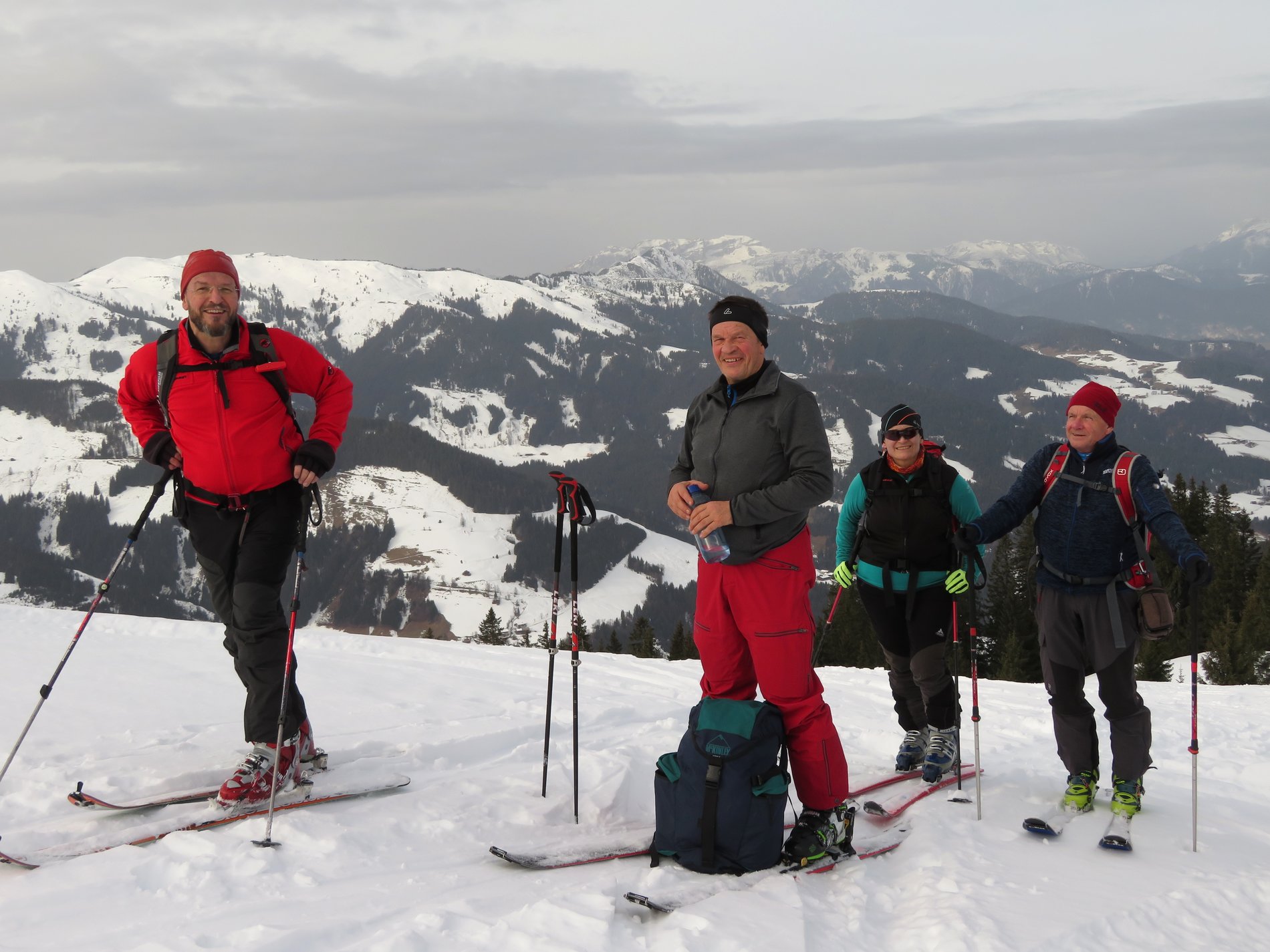 Die Schneelage war recht dürftig und an Touren in den heimischen Bergen war nicht zu denken. In den Kitzbühelern war die Schneelage besser, wenn auch dort der Schnee nicht in rauhen Mengen gefallen war. Der Startpunkt der Tour aufs Feldalphorn lag nur knapp unter 1000 m. So konnten wir mit Skiern starten und letztendlich auch wieder bis ins Tal abfahren. Dazwischen lagen die schönen Kitzbühler-typischen Skihänge, an denen sicherlich jeder seine Freude hatte – von einem kurzen steilen Abstecher mal abgesehen.