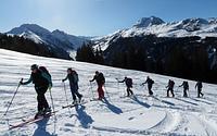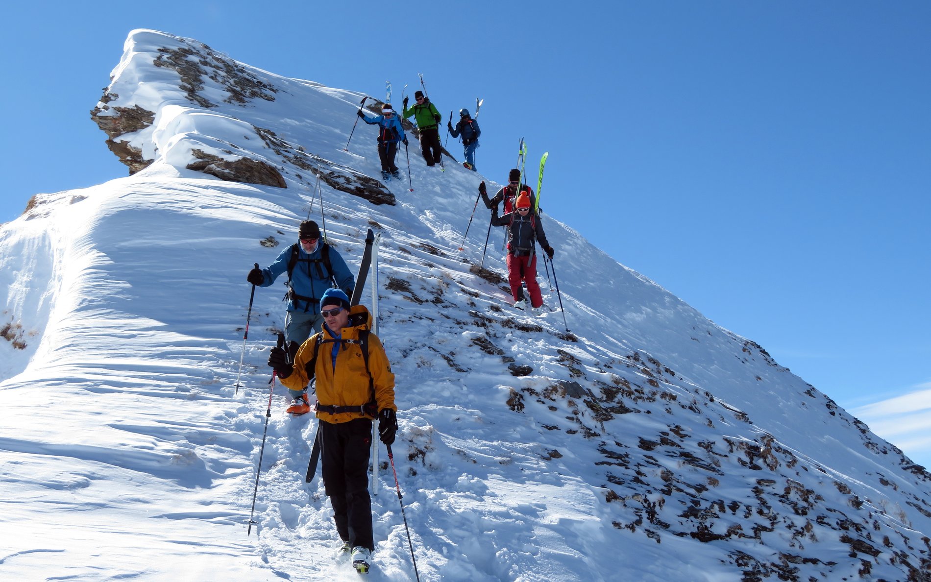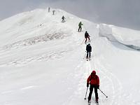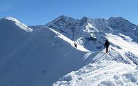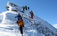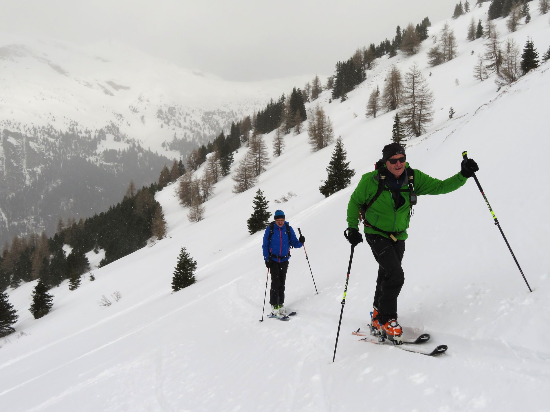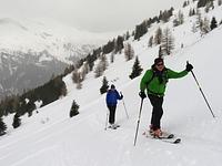 Der erste Tourentag führte die Skitourengeher vom Talschluss des zurecht hochgelobten Obernbergtals auf den Grenzkamm zwischen Österreich und Italien. Das Gipfelziel, den Hohen Lorenzen (2315 m) konnten sie in einer sehr lohnenden Gratüberschreitung über die Allerleigrubenspitze erreichen. Einziger Wermutstropfen war der sehr starke und eisig kalte Wind am Kamm. Die Abfahrt führte auf direktem und windgeschütztem Weg vom Gipfel über traumhafte Pulverschneehänge zurück ins Obernbergtal.