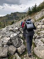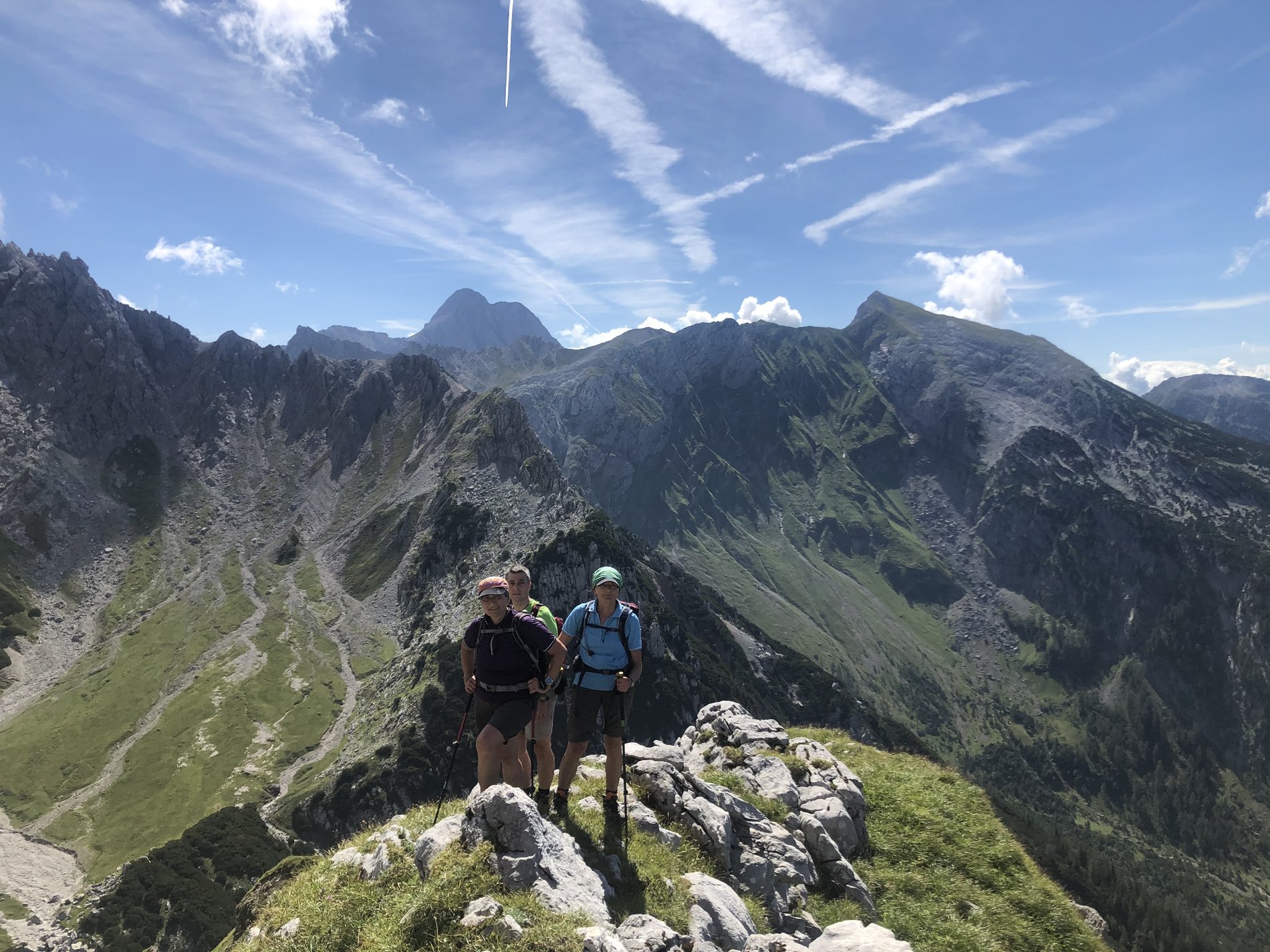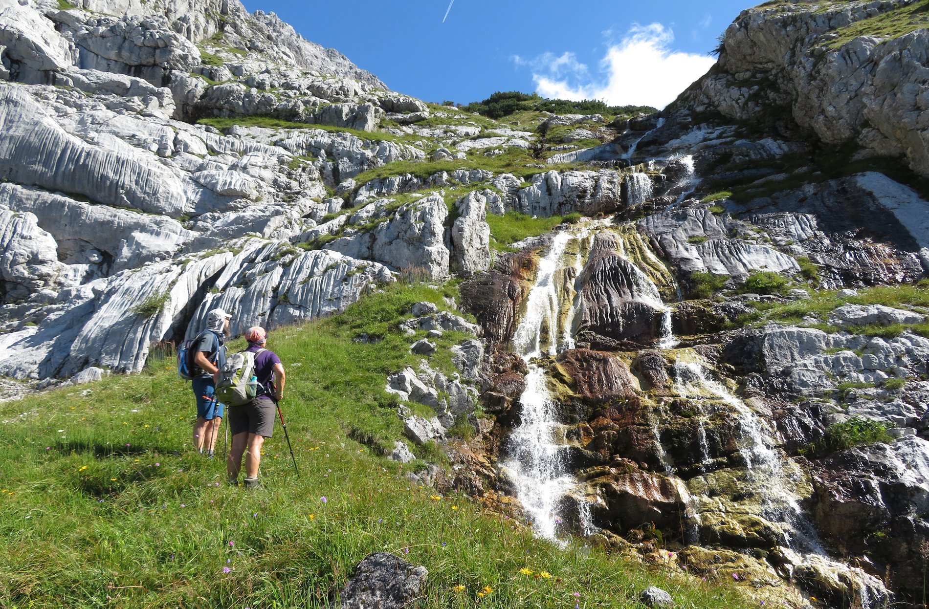 Einen Tag später, dafür mit bestem Bergwetter starteten wir vom Parkplatz Hintertal am Weißbach entlang, weiter über schmale Steigerl, steile Schuttströme und an Wasserfällen vorbei zum Alpelboden, einer fast verwunschen anmutenden Landschaft. Mit leichter Kraxlerei über felsigem Grat und teils ausgesetzt über steile Wiesen, führte der Hochgang eindrucksvoll in stetigem Auf und Ab letztendlich zum Karlkopf, dem namentlichen Ziel dieser Bergfahrt.