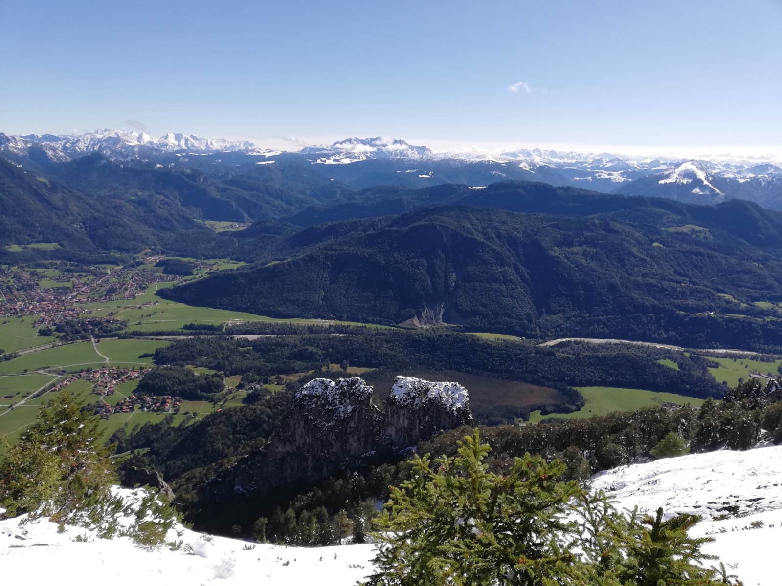 „Wo ist Gott?“ Unter diesem Leitgedanken stand die diesjährige spirituelle Wanderung der Sektion. Den Rahmen dieser Tour bildeten vier Stationen bei denen sich die Teilnehmer mit dieser Frage beschäftigten. Mit einer kurzen Vorstellungsrunde und einem gemeinsamen Lied ging es los. Nach einigen Minuten Gehzeit nutzten wir eine kleine Anhöhe um inne zu halten und die Umgebung mit allen Sinnen wahrzunehmen. Dazu wurden die Teilnehmer mit Hilfe ignatianischer Spiritualität angeleitet. Weiter ging es nun durch den Wald und schließlich hinauf auf die Aussichtsplattform der Gscheurerwand. Ein beeindruckender Ausblick auf den Chiemsee und die umliegenden Berge erwartete uns hier. Das eindrucksvolle Naturerlebnis wurde mit einem live gespielten Flötenstück begleitet.