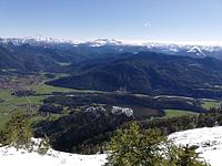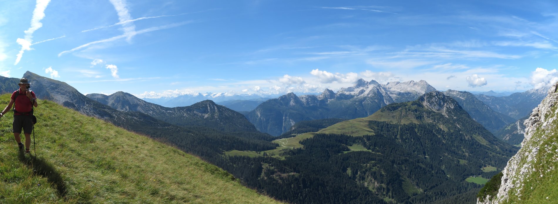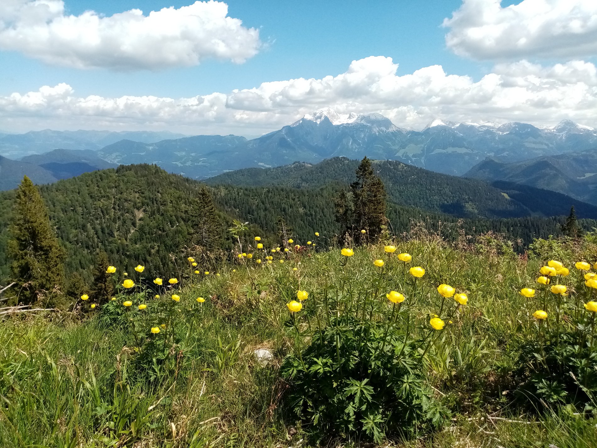 Bedingt durch ein paar Regentage war der Maximiliansreitweg teilweise schmierig und erforderte sicheres gehen. Je höher wir kamen, desto wärmer wurde es, der Weg wurde sicherer und die Augenblicke auf die schneebedeckten Gipfel vom Hohen Göll und Watzmann wurden mehr. Das letzte Wegstück zum Gipfel war felsig und erforderte Trittsicherheit und Händeeinsatz. Der Platz für die Brotzeit auf dieser Aussichtsloge gehörte uns ganz alleine. Fast noch ein Geheimtyp in Coronazeiten, wo viele Touren überlaufen sind.
