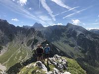 Ein fast voll besetzter Parkplatz in der Frühe deutete auf ein dichtes Gedränge um das Gipfelkreuz. Dem war Gott sei Dank nicht so, denn fast alle Wanderer gingen auf das Trainsjoch und wir hatten unseren Berg fast alleine für uns. Das in Sichtweite liegende Wildenkarjoch konnten wir aus Zeitmangel nicht mehr besteigen. Die zwei Almen beim Abstieg waren leider nicht bewirtschaftet und so konnten wir unseren Durst und Hunger erst in einem Talbiergarten stillen.