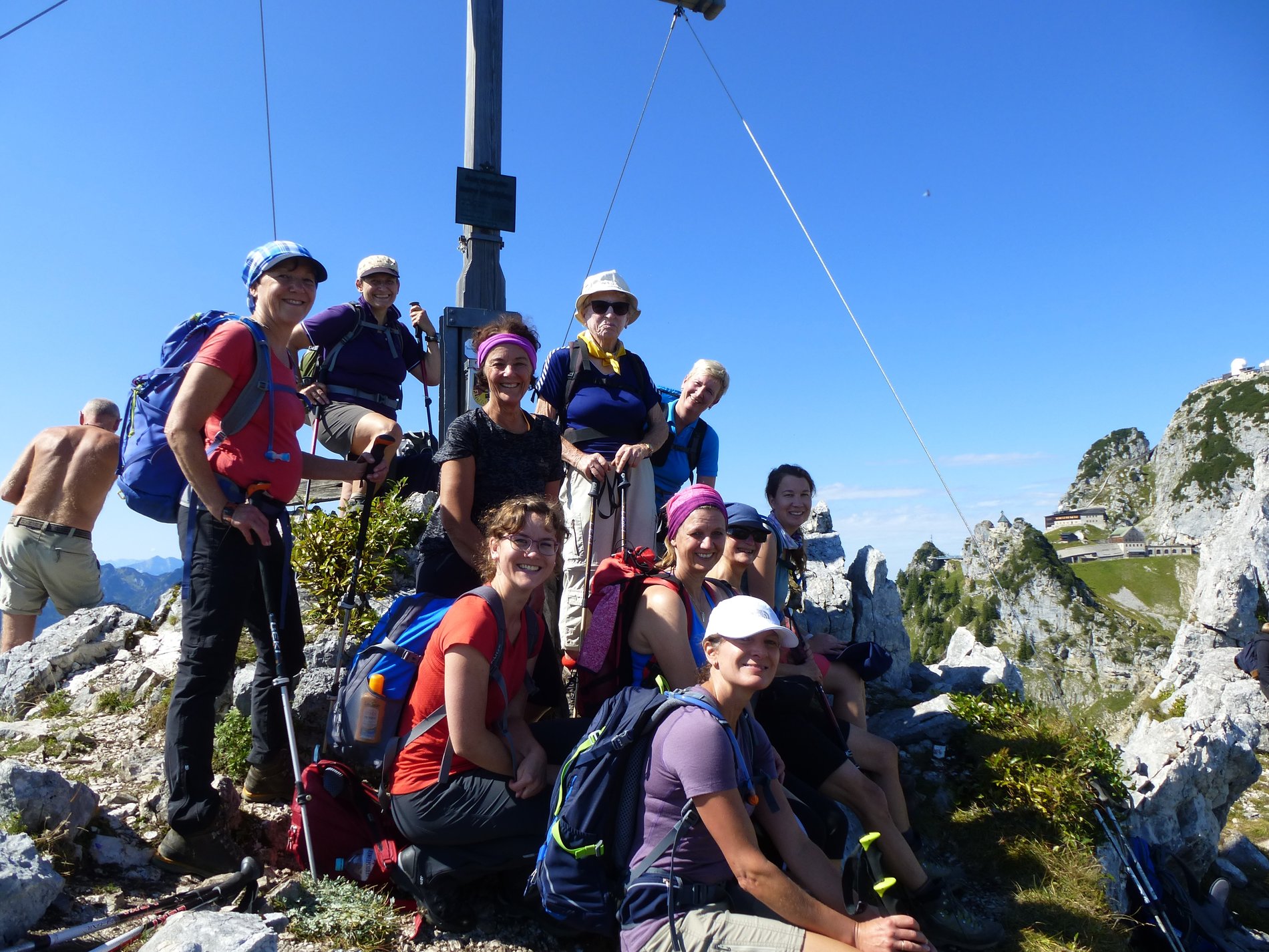 Dass die erste Tour im Sommer gleich mit ca. 1250 Hm begann, war so nicht vorhersehbar. Gestartet sind wir am Kreuzstein am Südufer vom Mondsee. Auf dem Wasserfallweg ging es gleich richtig steil im Wald bergauf, bis wir nach ca. 1½ Stunden die Eisenaueralm erreichten. Natürlich waren wir auch bis dahin nicht allein unterwegs, aber die Wanderer wurden zusehends mehr auf dem weiteren Aufstieg zum Suissensee und dann durch die drahtseilgesicherte Himmelspforte zum Gipfel. Hier tauchten wir in ein Meer von bergbegeisterten Menschen ein, denn schließlich lässt sich der Schafberg ganz einfach mit der Zahnradbahn von Süden erobern. Nach einer kurzen Gipfelbrotzeit flüchteten wir auf unserem Aufstiegsweg vor dem Gipfeltrubel, um ganz entspannt auf der Kienberghütte einzukehren.