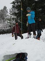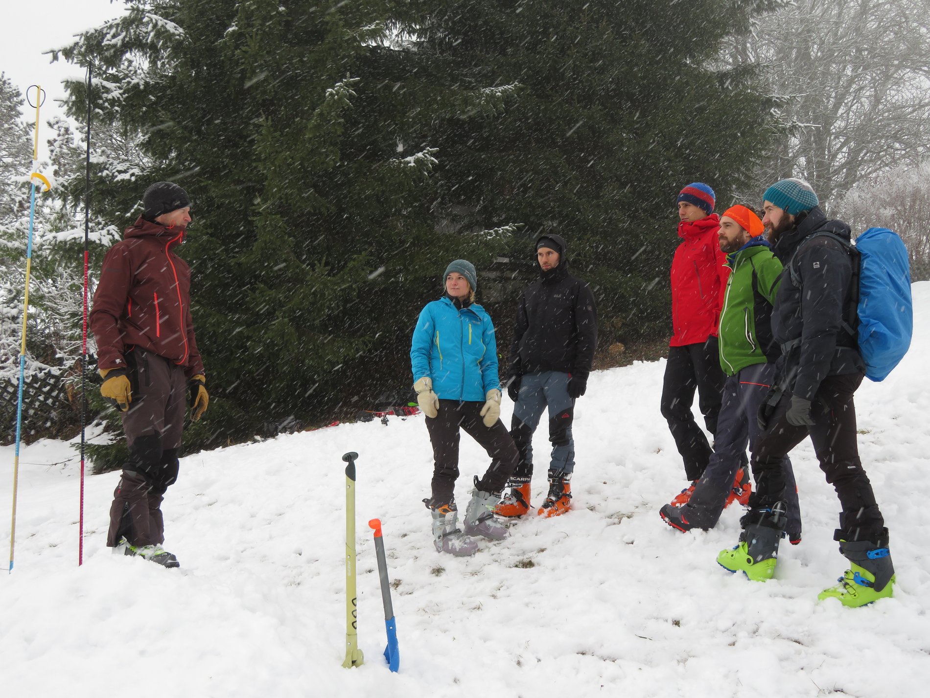 Die turnusmäßig eintägige Lawinenschulung fand auf der Aschinger Alm am Zahmen Kaiser statt. Zahlreiche Schneeschuh- und Skitourengeher hatten sich dort eingefunden, um die Lawinenverschüttetensuche nach der DAV-Lehrmeinung zu erlernen und in möglichst realitätsnahen Szenarien zu üben.