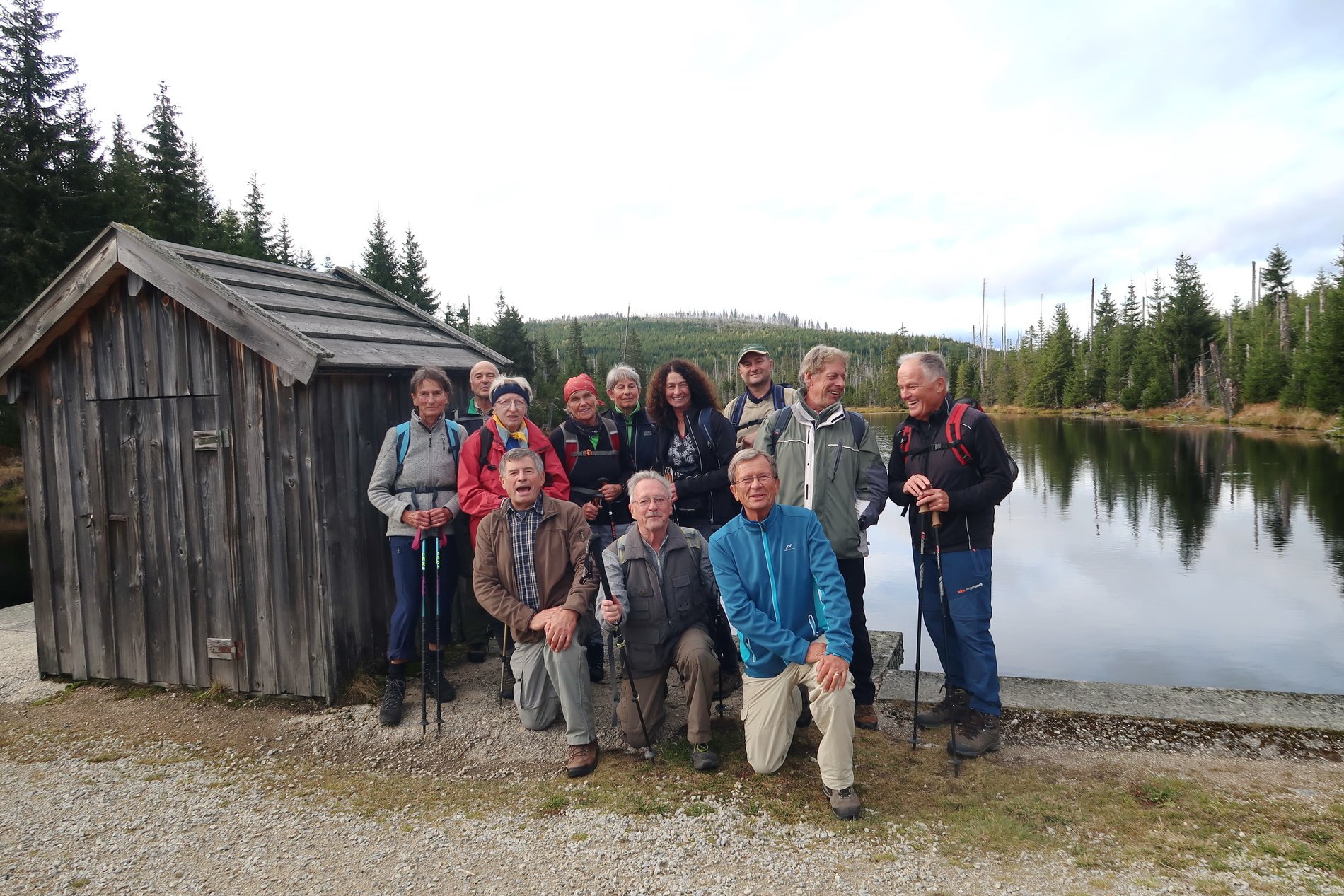 Vom Museumsort Finsterau ging es auf von zahlreichen Fliegenpilzen gesäumten und abwechslungsreichen Waldpfaden zum alten Grenzübergang nach Bučina. Der einstündige Abstecher zur Moldauquelle lohnte sich. Aus einem großen Loch eines Felsblockes blubberte das Wasser über eine Kaskade in den Wald. Der Rückweg führte über den Wistelberg durch einen Talkessel zur Teufelsbachklause, die eher wie ein in Hügeln eingebetteter Gebirgssee wirkt. Dieser See wurde bis in die 1960er Jahre für die Holztrift genutzt. Entlang des mystischen und wildromantischen Reschbaches marschierte die Gruppe dann talwärts auf felsigen und wurzeligen Waldwegen.