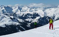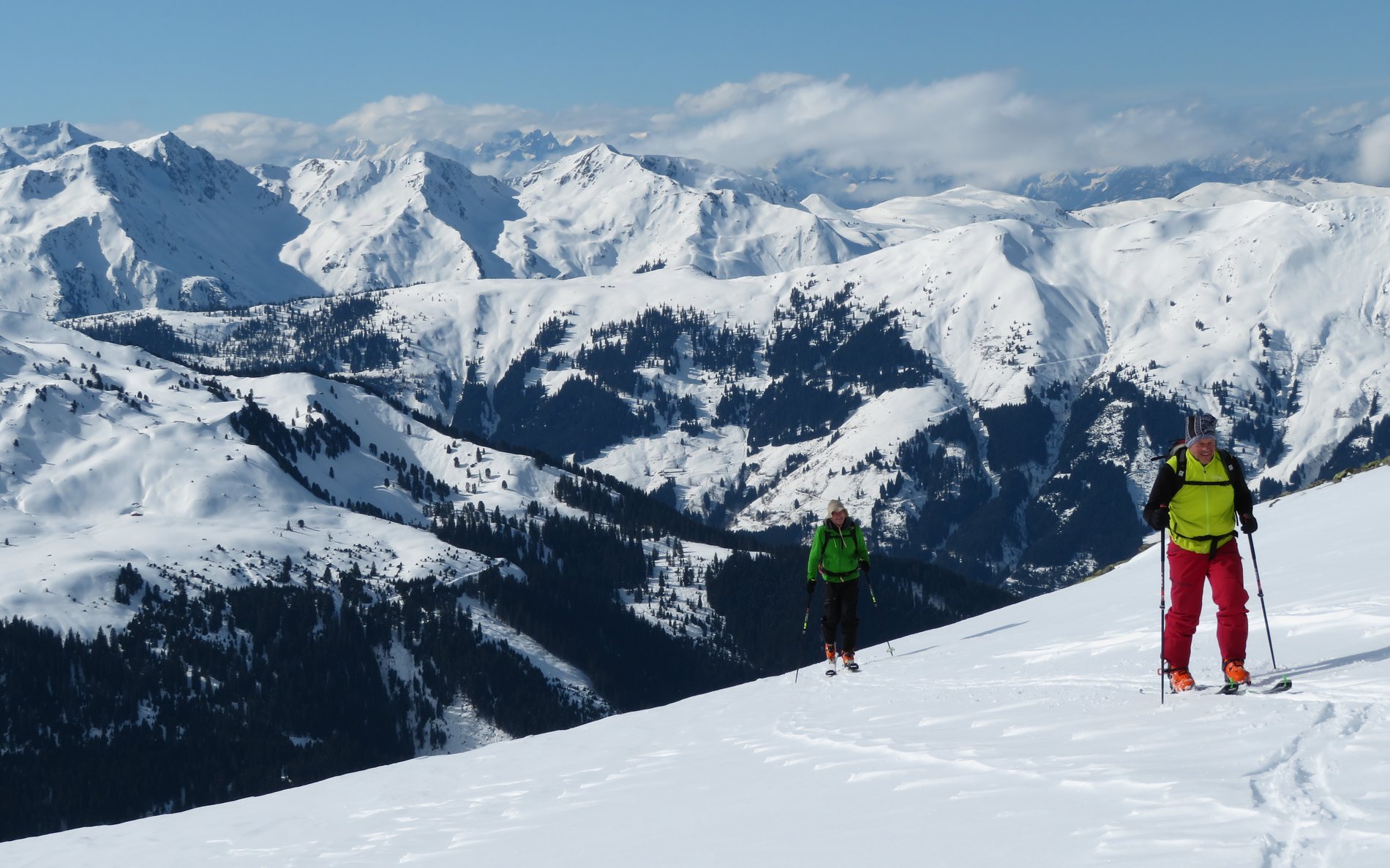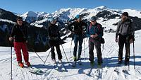 Und wieder einmal, dieses Mal bei schönstem Bergwetter, fuhren wir in die Kitzbühler zum Skitourengehen. Das Ziel war der Schwarzkogel, den wir von Aschau im Spertental aus bestiegen. Anfangs ging’s über eine kleine Skipiste und überwiegend flaches Gelände aufwärts, grad passend für die eine oder andere Lektion in Skitechnik. Nach der harten und unangenehm zu gehenden Piste wurde das Gelände weiter und über freies Skigelände und einen zuletzt etwas abgeblasenen Rücken erreichten wir den Gipfel.