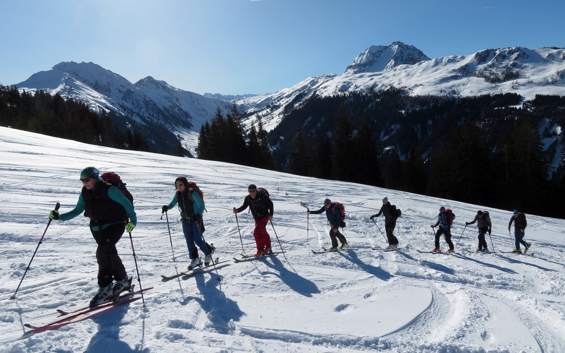 Coronabedingt verlegten wir unsere Schiarafahrt in den Rätikon, da in Italien nach wie vor zu große Einschränkungen vorherrschten. Als Stützpunkt wählten wir die Lindauer Hütte im Gauertal, die nicht nur genügend Plätze, sondern auch großartige Gipfelziele zu bieten hat. Gleich am ersten Tourentag bestiegen wir durch die wilde und sehr alpine Blodigrinne die Drusenfluh (2827 m). Der Anstieg führt über einen Klettersteig und erfordert im Gipfelbereich freies Klettern im 2. Schwierigkeitsgrad. Hinunter muss man dann auch wieder über den Klettersteig. Gleich am nächsten Morgen peilten wir das direkt über der Hütte liegende, weltbekannte Kalendermotiv der Drei Türme an. Durch abenteuerliches Gelände bestiegen wir als erstes den Großen Turm (2830 m) und anschließend den Mittleren Turm (2782 m). Für Franz Gönczi und Schoß Holzleitner war dies noch nicht genug. Sie gönnten sich noch den Südgrat auf den Kleinen Turm (2754 m). Immerhin eine Kletterei im dritten Schwierigkeitsgrad. Der letzte Tag brachte ein ganz besonderes Klettersteigerlebnis. Der Gauerblick-Klettersteig an der Sulzfluh (2818 m) führt nicht nur in moderater Schwierigkeit durch senkrechte Wände, sondern auch durch eine 350 Meter lange Höhle, in der es ohne Stirnlampe kein Durchkommen gibt. Fasziniert von den Erlebnissen dieser Tour, genossen wir auf der Tilisunahütte eine Brotzeit, bevor es über den aussichtsvollen und eindrucksvollen Bilkengrat wieder hinüberging zur Lindauer Hütte. Nach einer kurzen Rast stiegen wir ab in die Latschau und fuhren nach Hause. Bereits eine Woche später wurde Vorarlberg zum Risikogebiet erklärt. Gut, dass wir noch da waren und nicht nur schöne Berge, sondern auch ein sympathisches Hüttenteam kennenlernen durften.