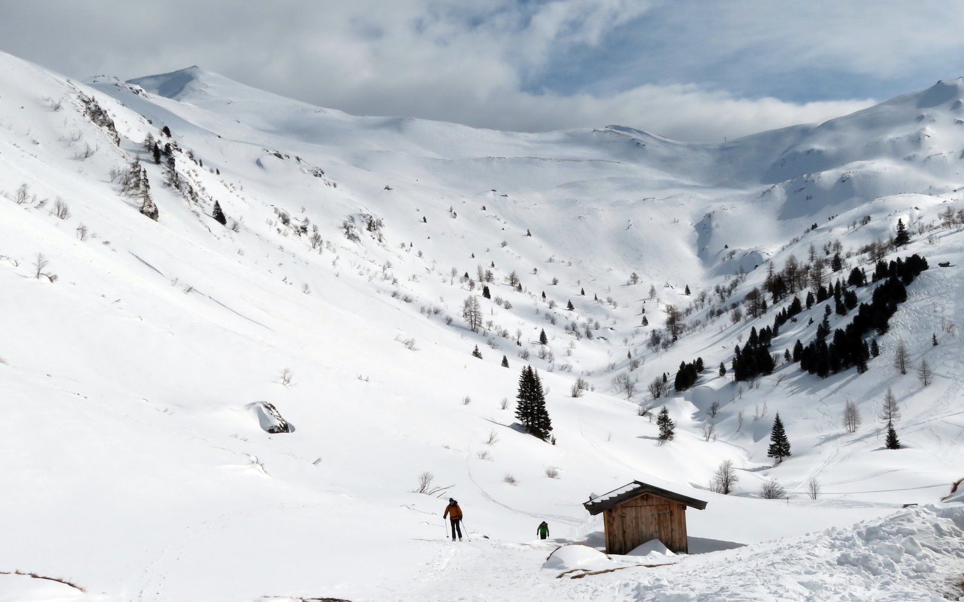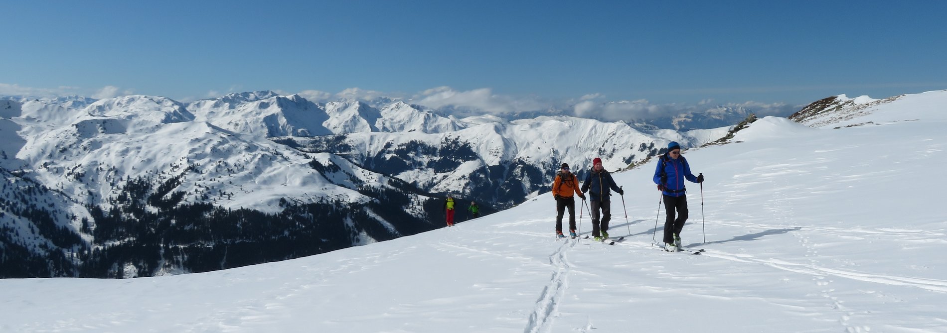 Am ersten Tag ging es vom kleinen Weiler Bundschuh durch tief verschneiten einsamen Winterwald hinauf zur Schöngelitzhöhe (1812 m), wo wir einen romantischen Sonnenuntergang genossen. Zwanzig Minuten später war die gemütliche Neue Bonner Hütte erreicht, wo wir die einzigen Gäste waren. Am nächsten Morgen zogen wir unsere Spur als erstes hinauf zur Ebenwaldhöhe (1848 m) und dann weiter über das Schereck (2181 m) hinüber zum Gipfel der Schwarzwand (2214 m). Bei strahlendem Sonnenschein freuten wir uns über die vielen flachen Berge, die sich in den Nockbergen aneinanderreihen. Auf anderer Route ging es dann wieder hinunter zu unserem Bus. Die Heimfahrt unterbrachen wir in Hallein, wo wir im Brauereigasthof Kaltenbach auf zwei herrliche Tage in den Bergen zurückblickten.