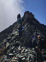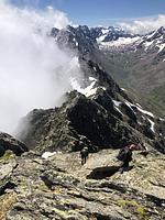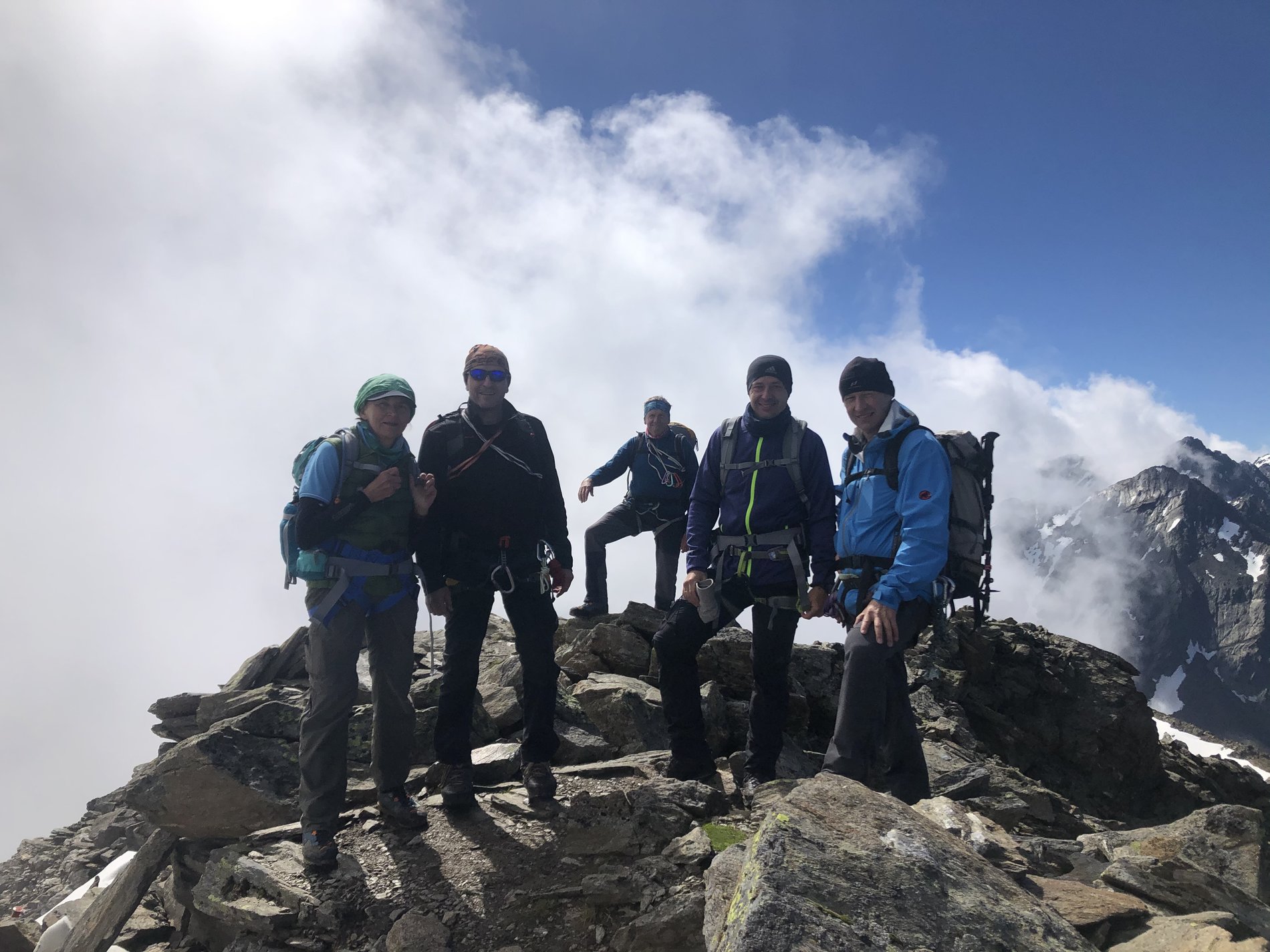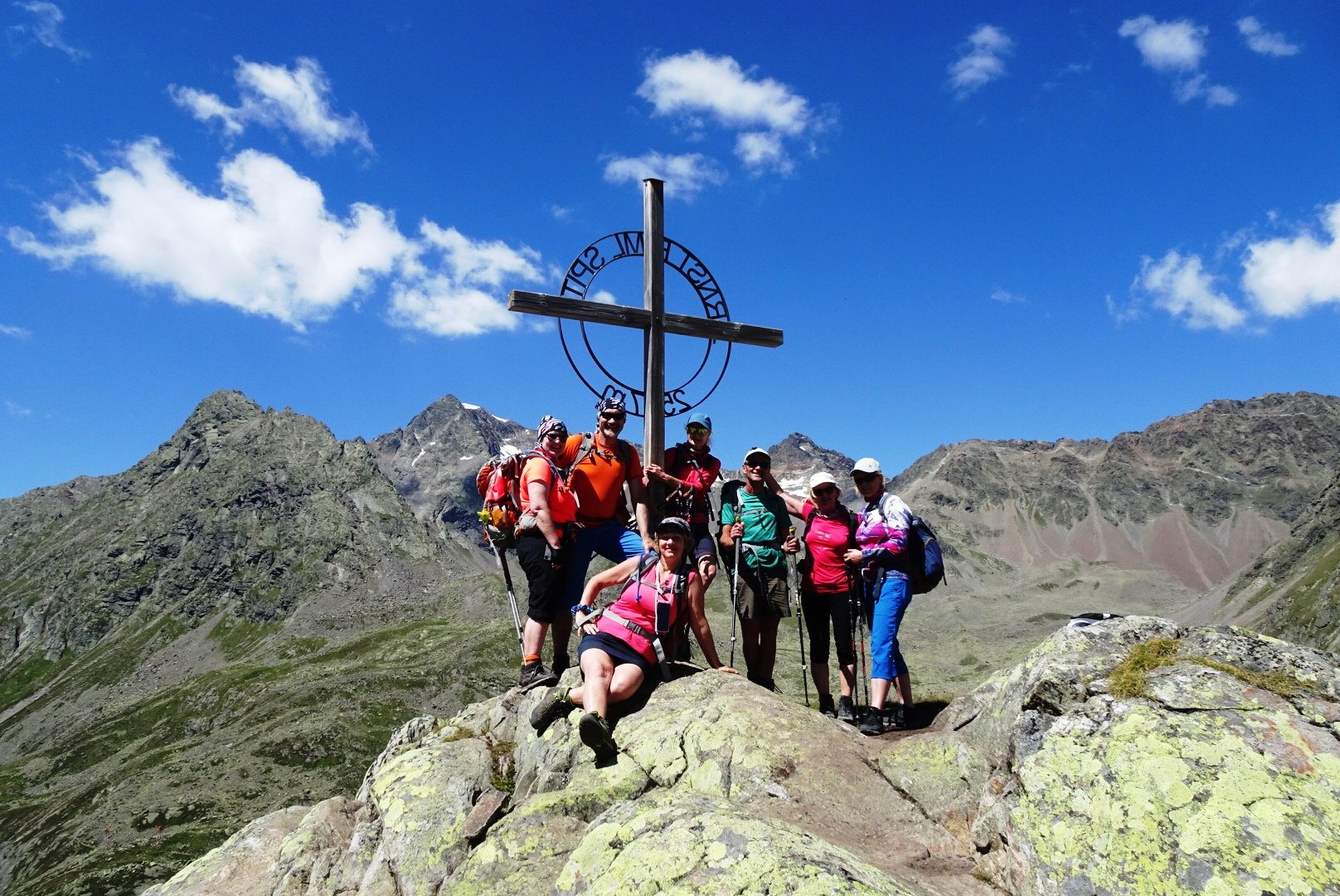 Wie inständig erhofft, konnten wir am Sonntag bei bestem Bergwetter Richtung Gleirschjöchl aufbrechen, von wo aus der Gleirscher Rosskogel einfach zu erreichen ist. Mit angelegtem Gurt, noch ohne Seilsicherung, ging’s nun entlang der „Via Mandani“ einem hochalpinen Steig entlang des 3.000er Grates, anregend hinüber zum Zwieselbacher Rosskogel. Aufgrund der nie wirklich schwierigen, jedoch durchaus ausgesetzten Felsauf- und -abschwüngen bis zum II. Grad und vor allem aufgrund der souveränen Beherrschung des Geländes durch alle Teilnehmer, konnte auch an der Schlüsselstelle, ein 30-m-Steilaufschwung, und somit während der kompletten Überschreitung das mitgeführte Seil im Rucksack verbleiben.