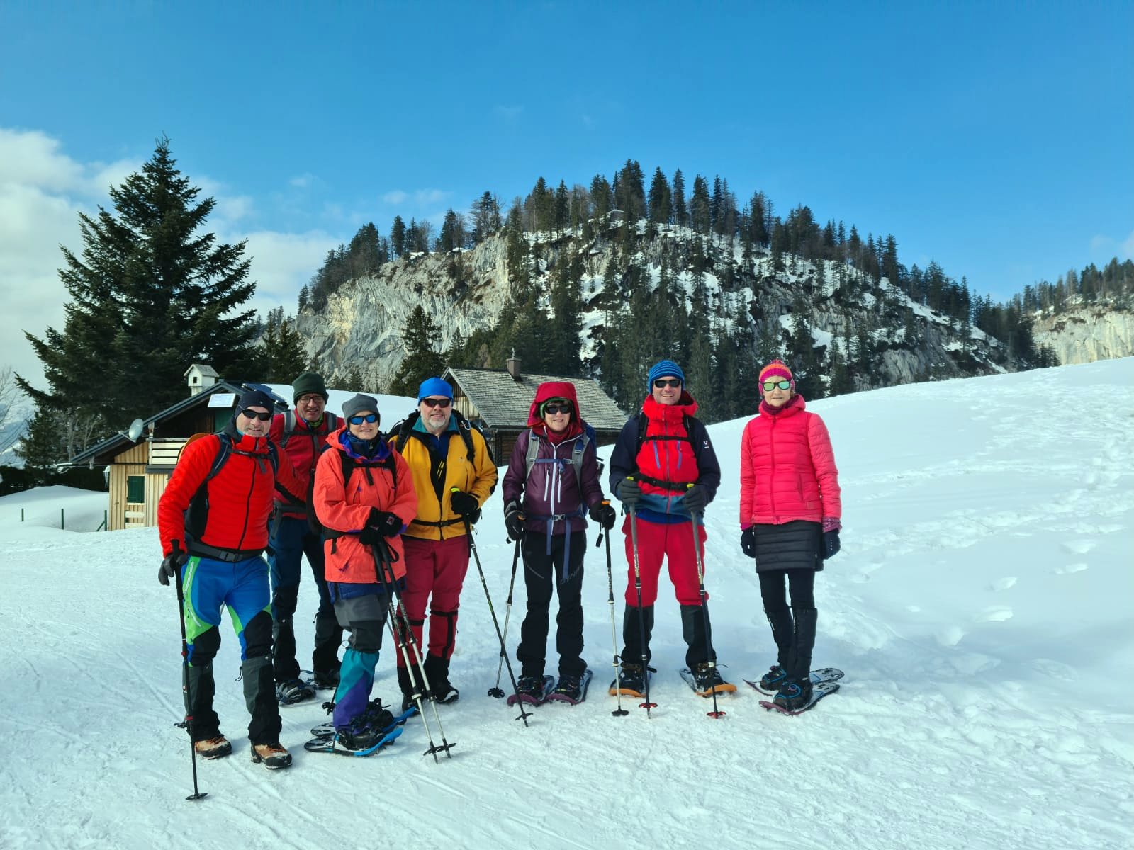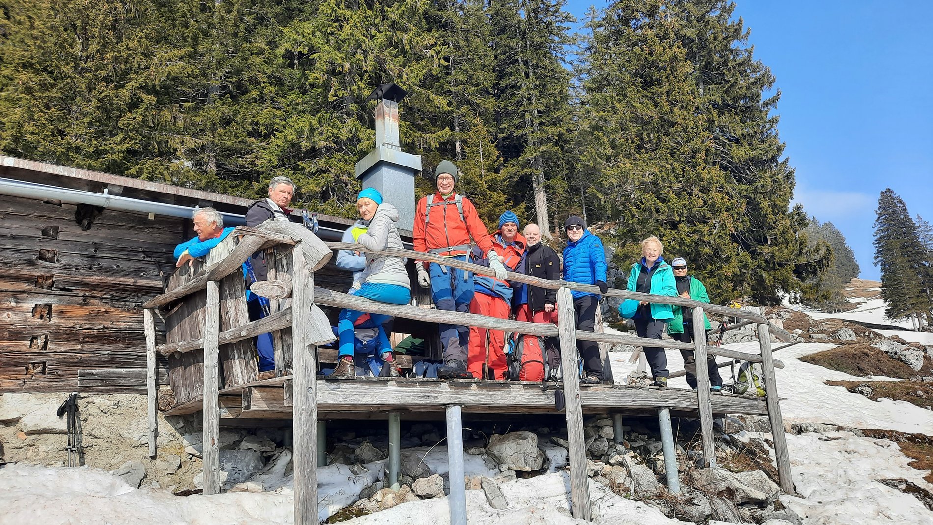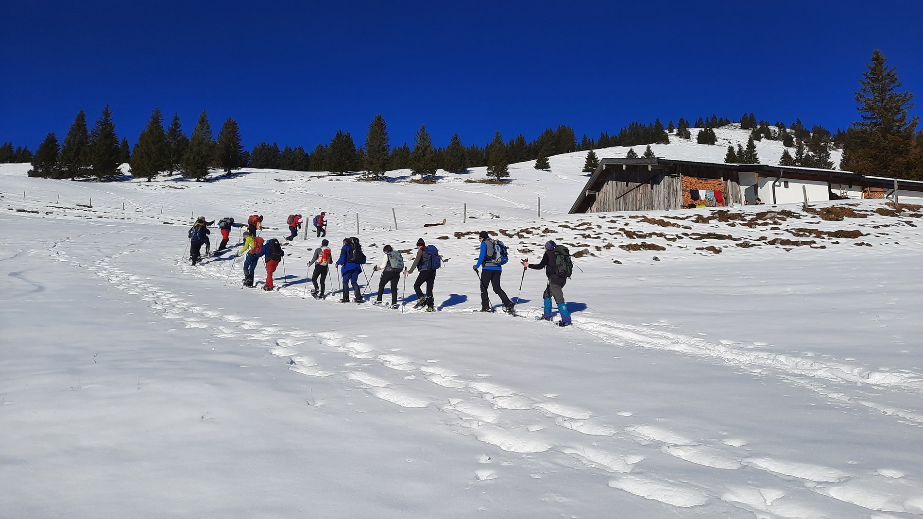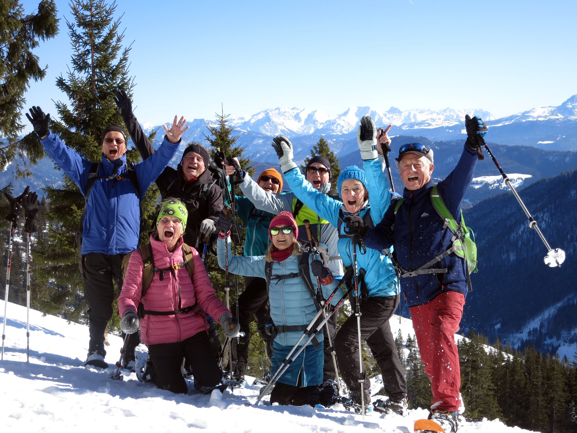 Die Aussicht zum nahen Chiemsee, zum Kaisergebirge und zu weiteren bekannten Gipfeln ließen die Mühen schnell vergessen. Nach einer ausgiebigen Rast auf der schneeverwehten Hütte machten sich einige den Spaß, über das Hüttendach zu steigen. Der Abstieg im Hainbachtal beendete eine genussvolle Winterbergwanderung.