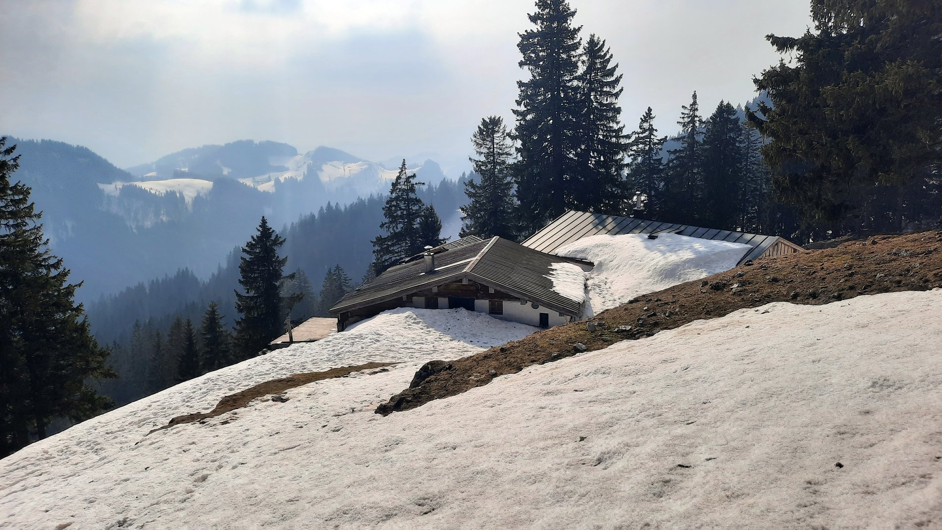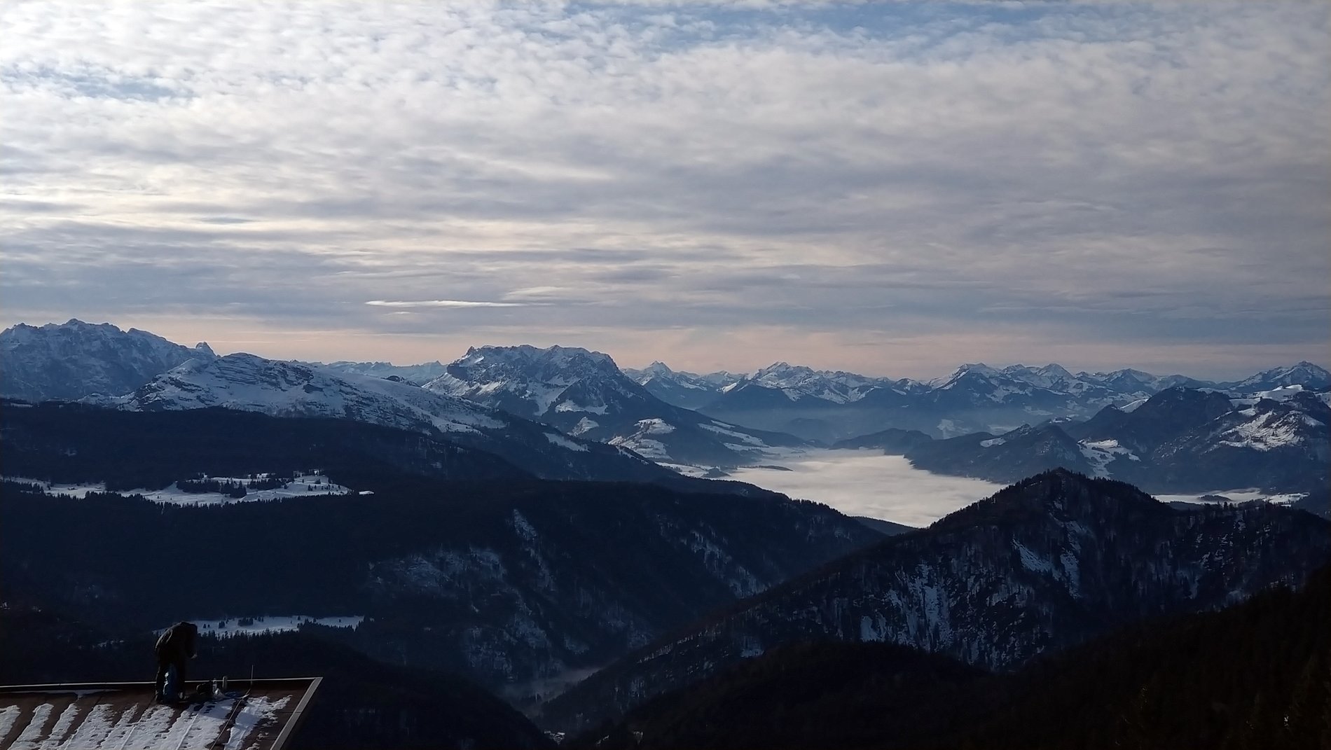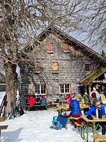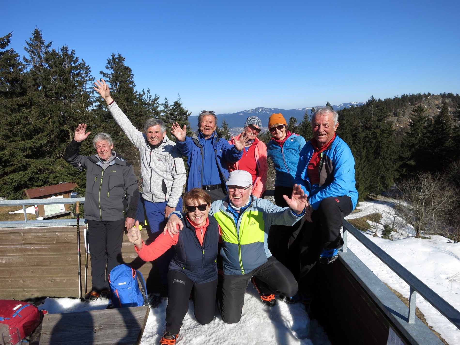 Die Aussicht zum nahen Chiemsee, zum Kaisergebirge und zu weiteren bekannten Gipfeln ließen die Mühen schnell vergessen. Nach einer ausgiebigen Rast auf der schneeverwehten Hütte machten sich einige den Spaß, über das Hüttendach zu steigen. Der Abstieg im Hainbachtal beendete eine genussvolle Winterbergwanderung.