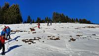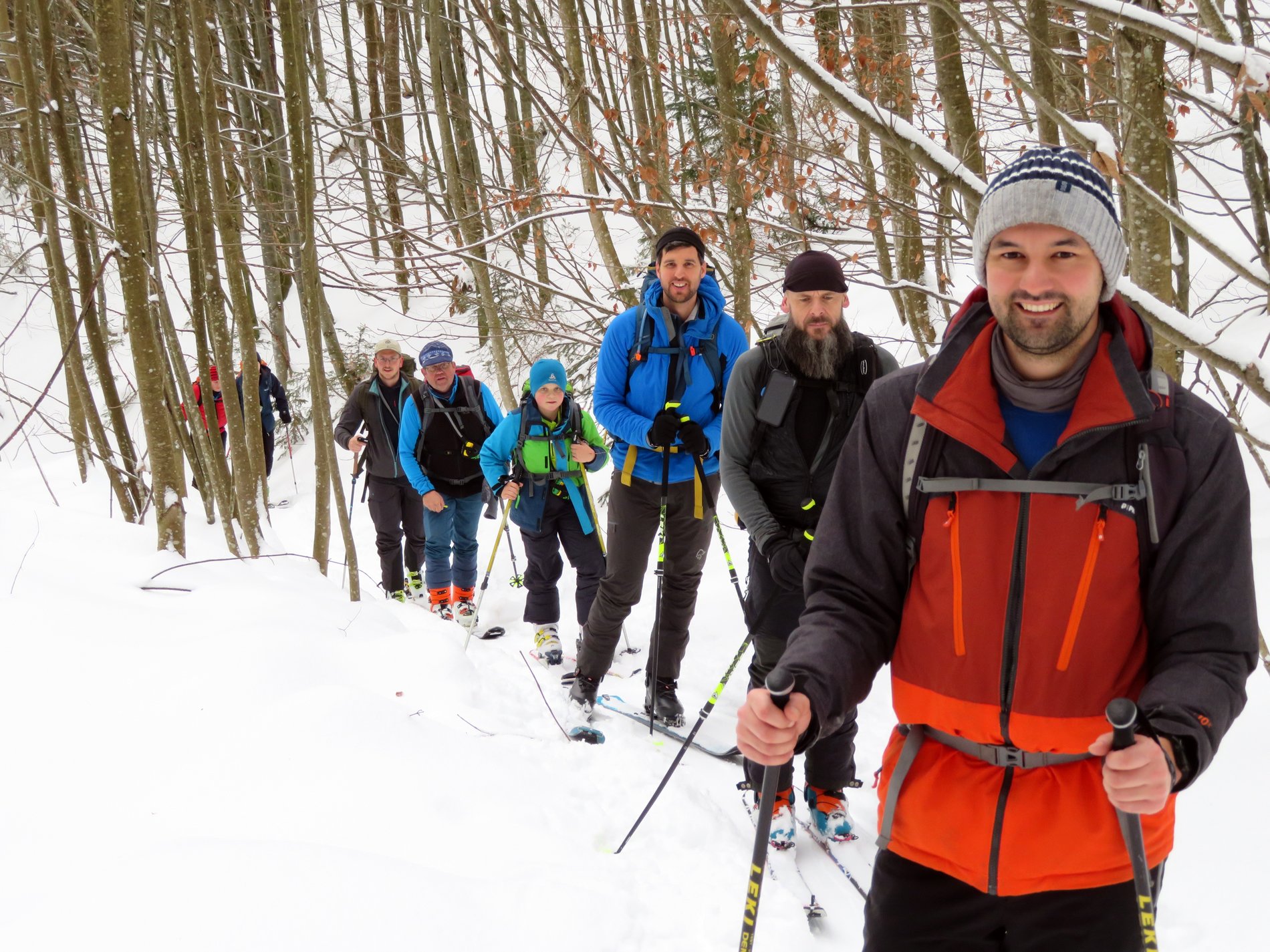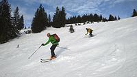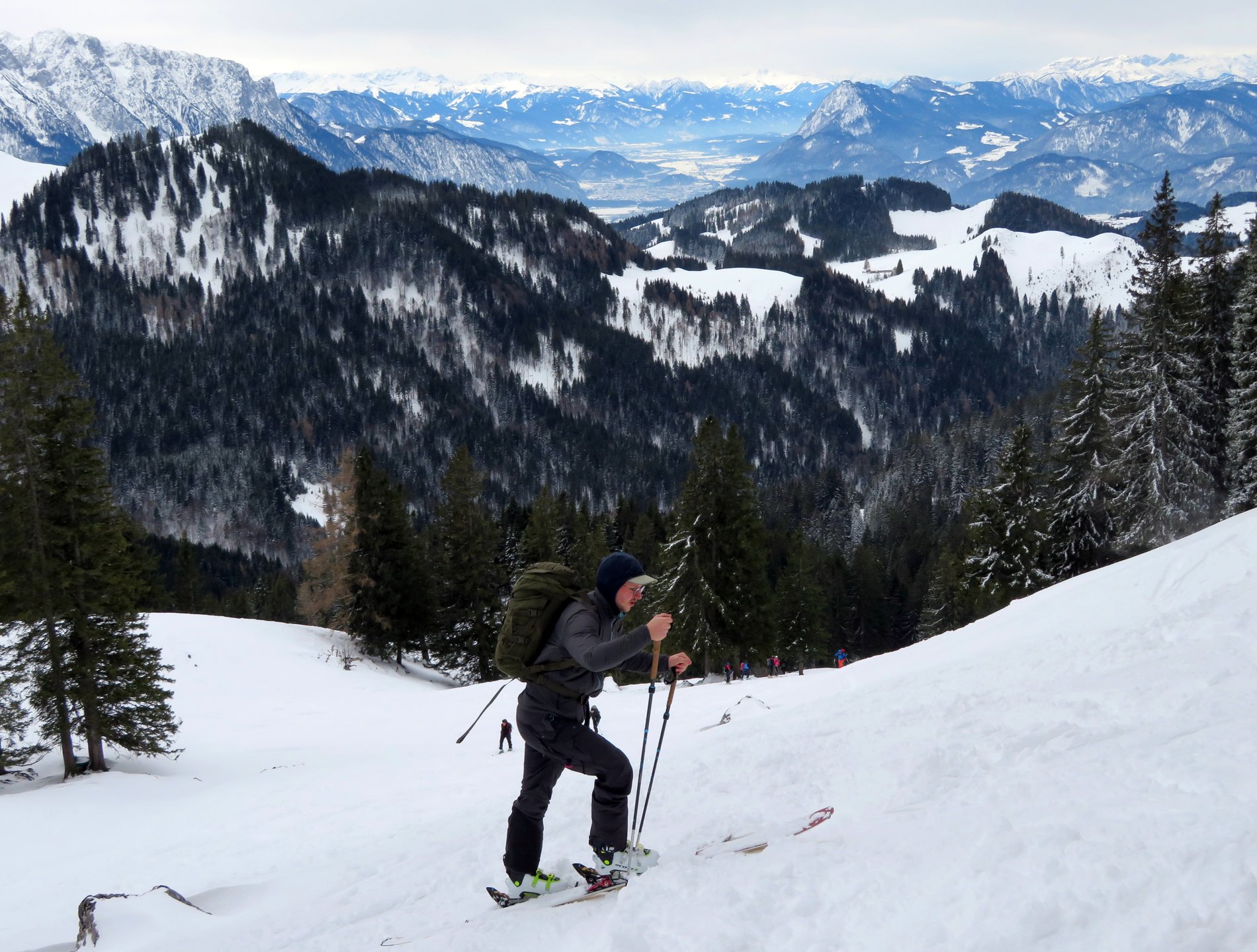 Startpunkt dieser Tour war am Parkplatz Heufeldbauer, bei schon ordentlich Betrieb. Die meisten zieht’s dann aber zum ein paar Meter höheren Sonntagshorn, so konnten wir unsere Spuren zum Vorderlahnerkopf alleine ziehen. Nach verdienter Rast wählten wir die Abfahrt durch die Reifelrinne Richtung Hochalm. Für einen Teil der Gruppe war die Verlockung einer gemütlichen Einkehr zu groß, der Rest bestieg noch das 1720 m hohe Peitingköpfl vor der Einkehr in der Hochalm. Die Abfahrt, angfangs über die Hochalmstraße, wartete mit kleinen schönen Hängen und mancher Engstelle auf.