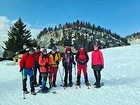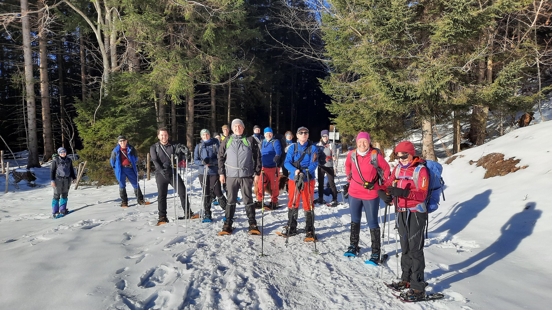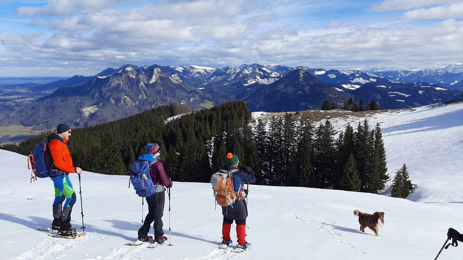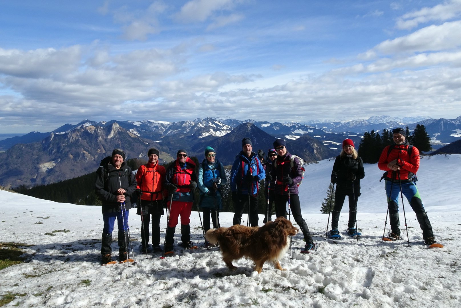 Für die erste Schneeschuhtour unsere Sektion war das Feichteck unser Ziel. Wenn der Schnee auch nicht arg viel war, das Wetter war auf unserer Seite. Bei strahlendem Sonnenschein erreichten wir über die Feichteckalm den Gipfel. Hier konnten wir in der Sonne gemütlich Brotzeit machen und den Blick auf die umliegenden Gipfel und das Alpenvorland genießen.
