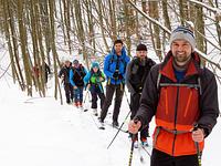 Der Kaitersberg ist ein markanter Bergkamm im Bayerischen Wald, der von Bad Kötzting bis zum Arber reicht. Aufgrund des hartgefrorenen Schnees verzichtete die Gruppe auf Schneeschuhe, stattdessen waren Grödel, eine Art Leichtsteigeisen, für diese Tour die bessere Wahl.