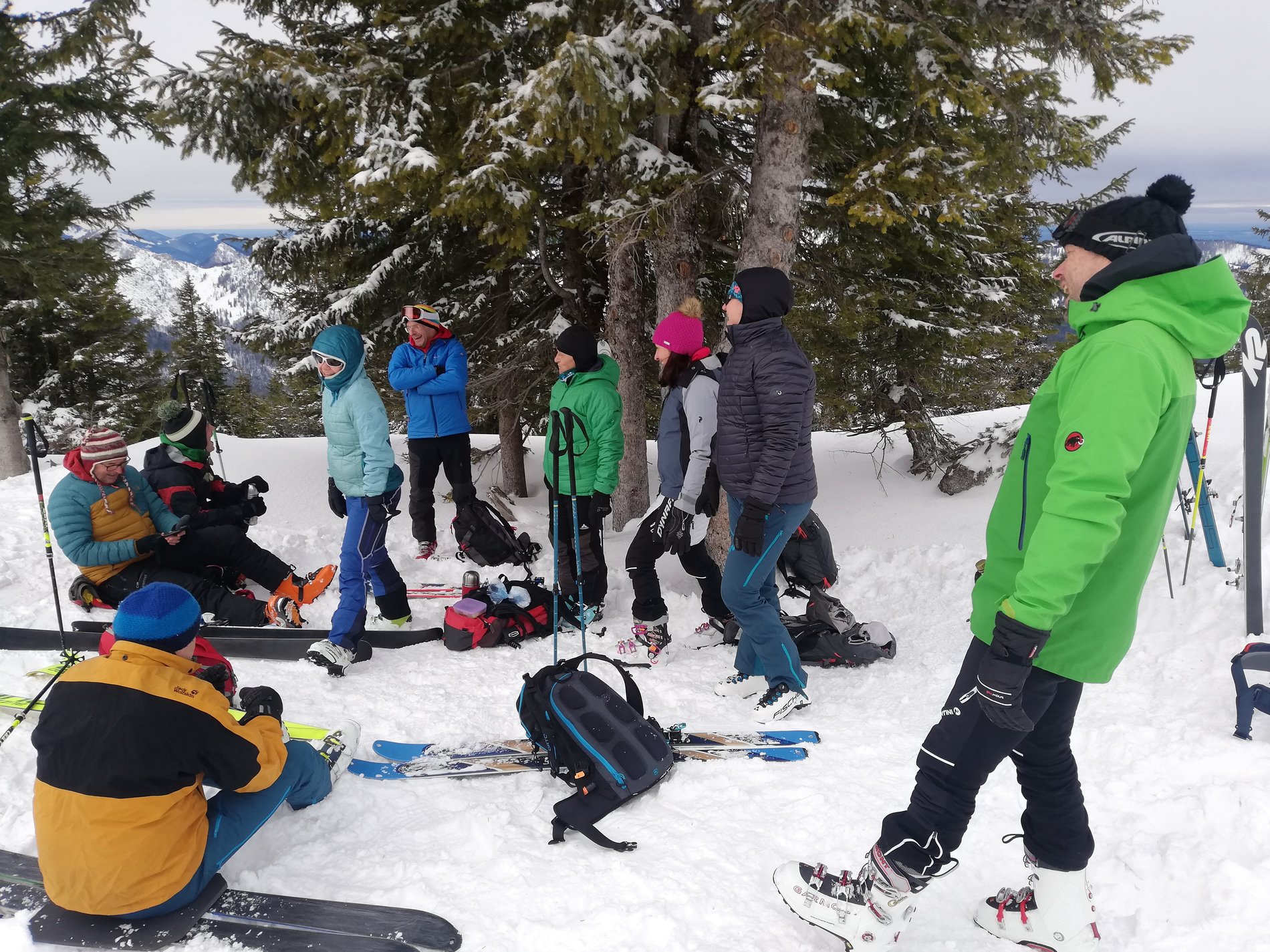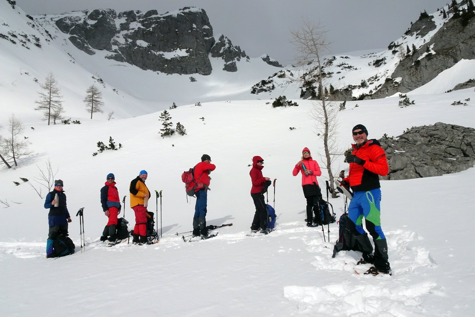 Haaralmschneid? Mühlhornwand? Hauptsache Skitour! Die Lawinenlage ließ eine Tour, vor allem mit einer 19 Personen starken Gruppe, auf die Haaralmschneid nicht zu. In solch einem Fall ist die Mühlhornwand mit mäßigen steilen Anstiegen ein angemessenes Ausweichziel. Leicht bewöltk war’s und etwas frisch am Gipfel. Aber wichtiger war eine gute Schneelage für’s Tiefschneefahren und für die Abfahrt bis zum Ausgangspunkt. So kam jeder auf seine Kosten, die jungen Skitoureneinsteiger wie auch die alten Hasen.