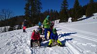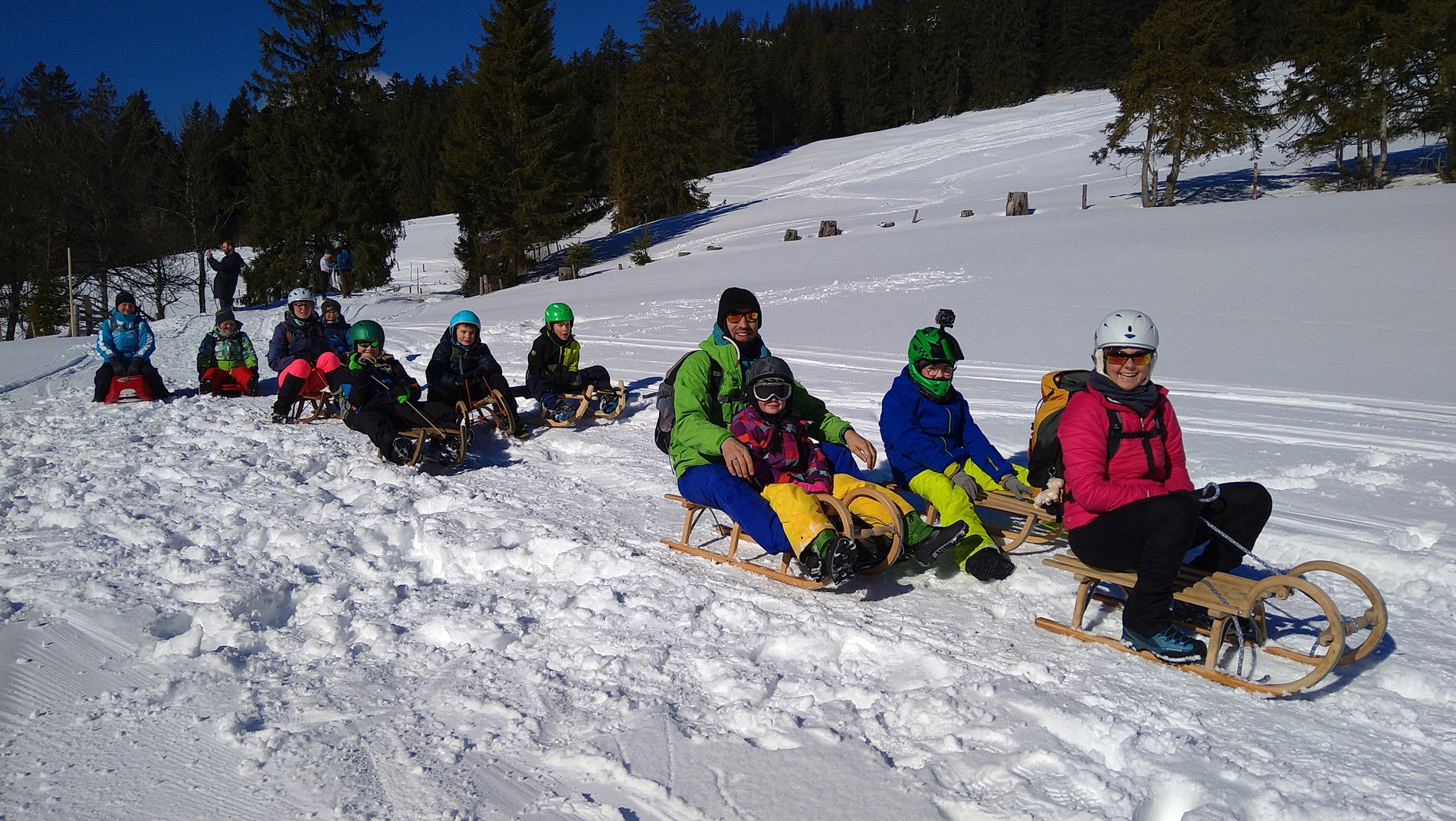 Über breite Forststraßen zogen wir unsere Schlitten, in Richtung der Priener Hütte. Dass diese Rodelbahn zu einer der längsten im Chiemgau gehörte, bemerkten wir. Auf einer Höhe von ca. 1200 Meter war unser Zenit erreicht und die Freude aufs Hinuntersausen überwog. Doch mit dem Sausen war es gar nicht so einfach, manche Schlitten bockten einfach und rutschten nicht so richtig. Letztendlich kamen wir alle irgendwie unten an und bei einer Einkehr in der Müllner Alm waren alle Strapazen vergessen.