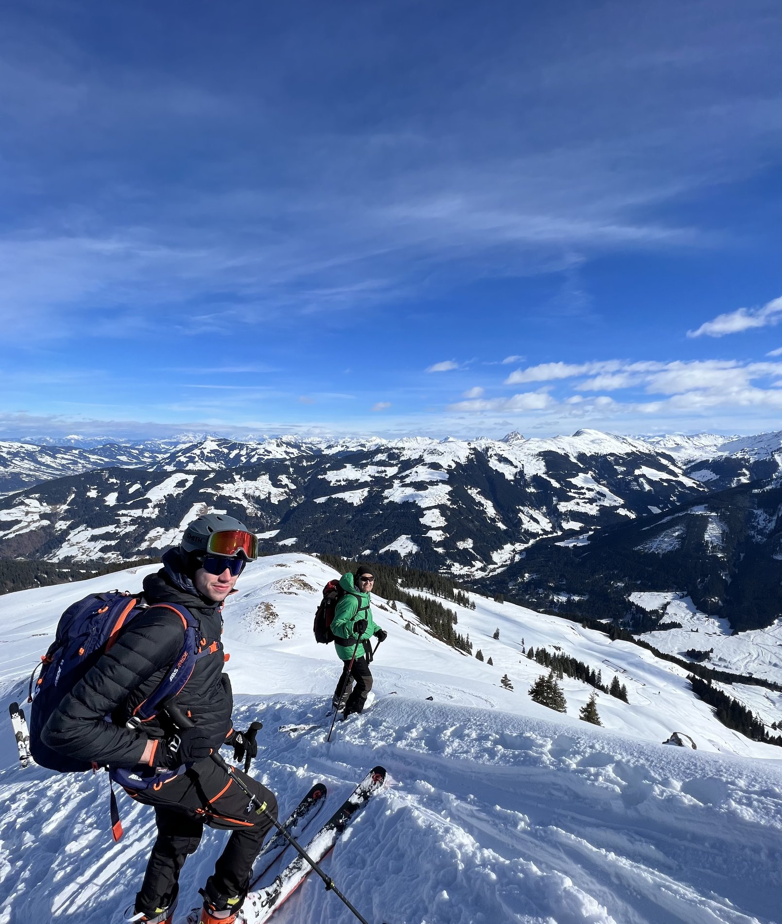 Wir starteten an der Mautstelle in der Kelchsau. Über die selten steilen Hänge der Schwaigbergalmen stiegen wir hinauf zum Nordost-Grat des Schwaigberghorns. Den steilen Grat legten wir zu Fuß zurück, für Spitzkehren war da kein Platz mehr.
