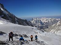 Der untere Teil des Rofenkarferners diente uns noch zur Hochtourenausbildung. T-Anker, Eisschrauben und Abalakov-Eisuhr lernten wir als Sicherungspunkte im Gletscher kennen.