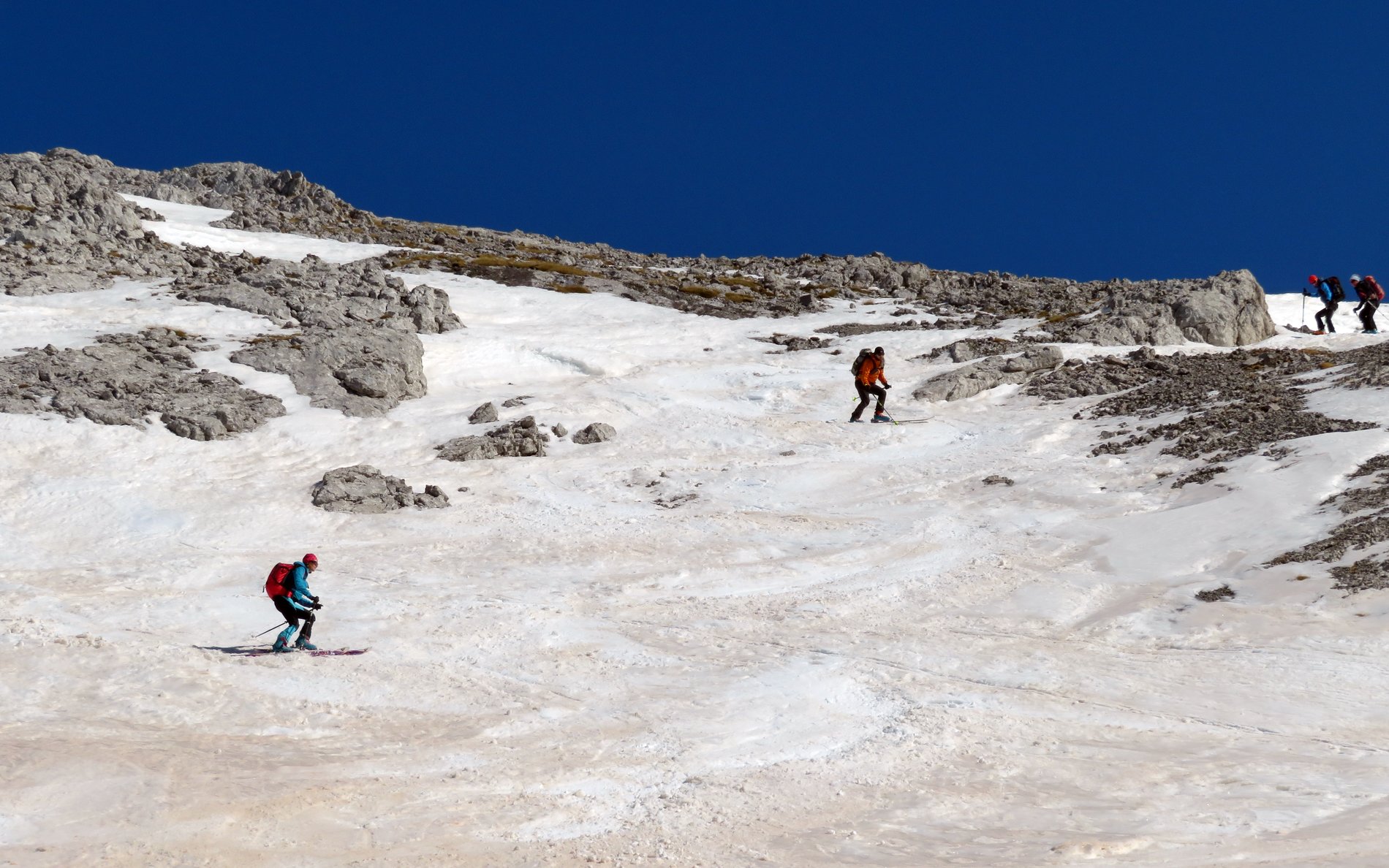 Nach gemütlicher Gipfelrast bei strahlend blauem Himmel fuhren wir auf gleicher Route zurück zum Startpunkt, bei untenraus geringer und mittlerweile weicher Schneeauflage.