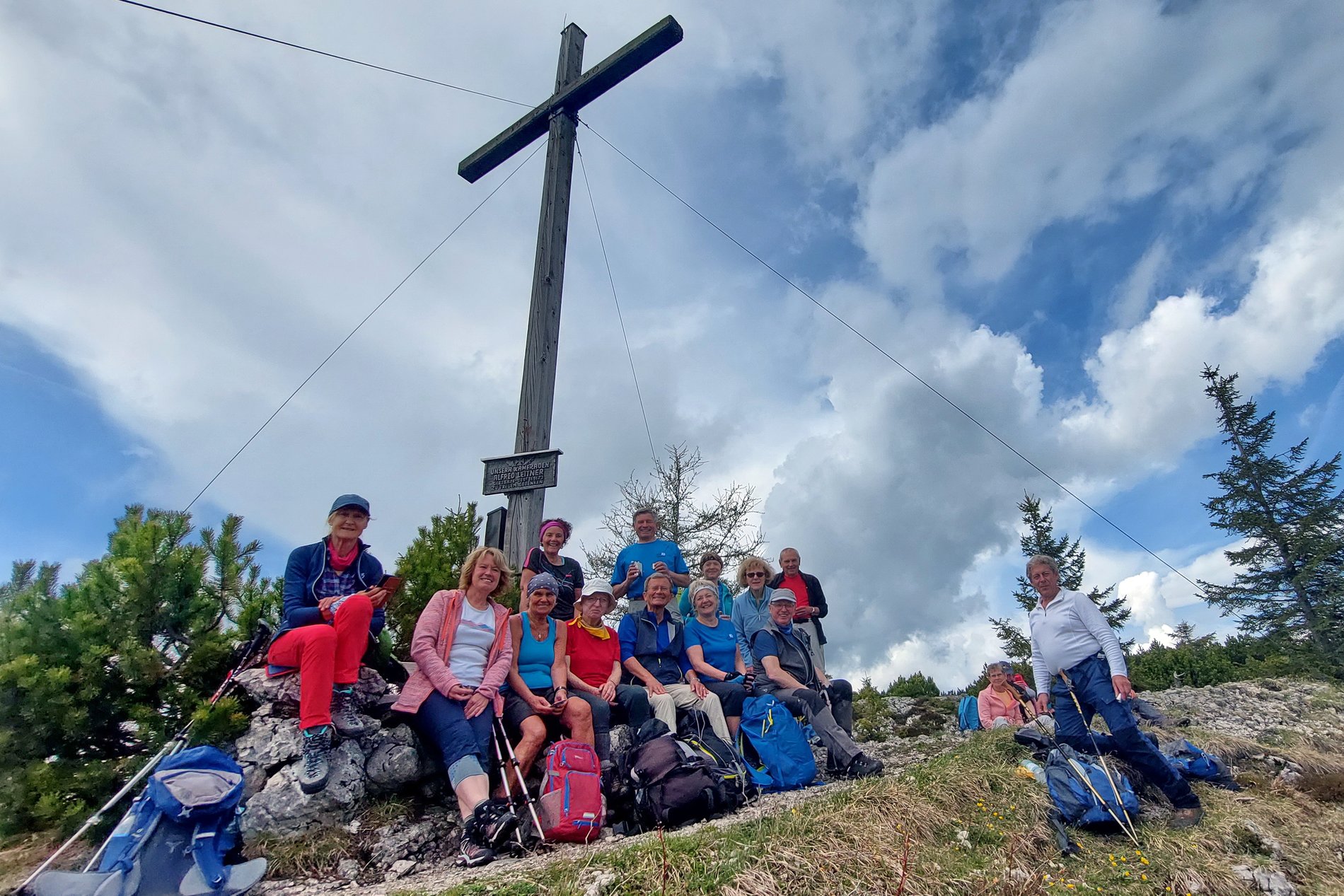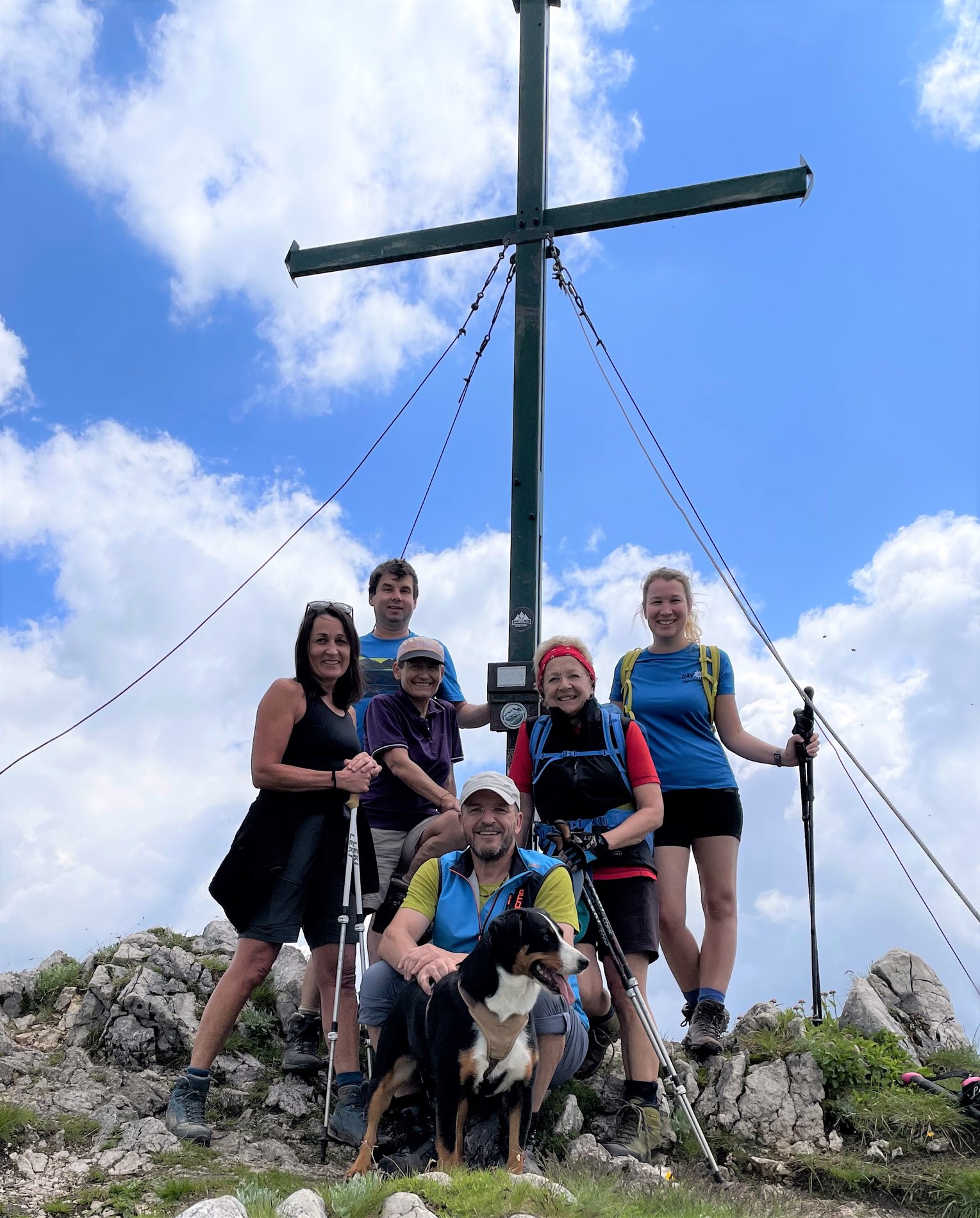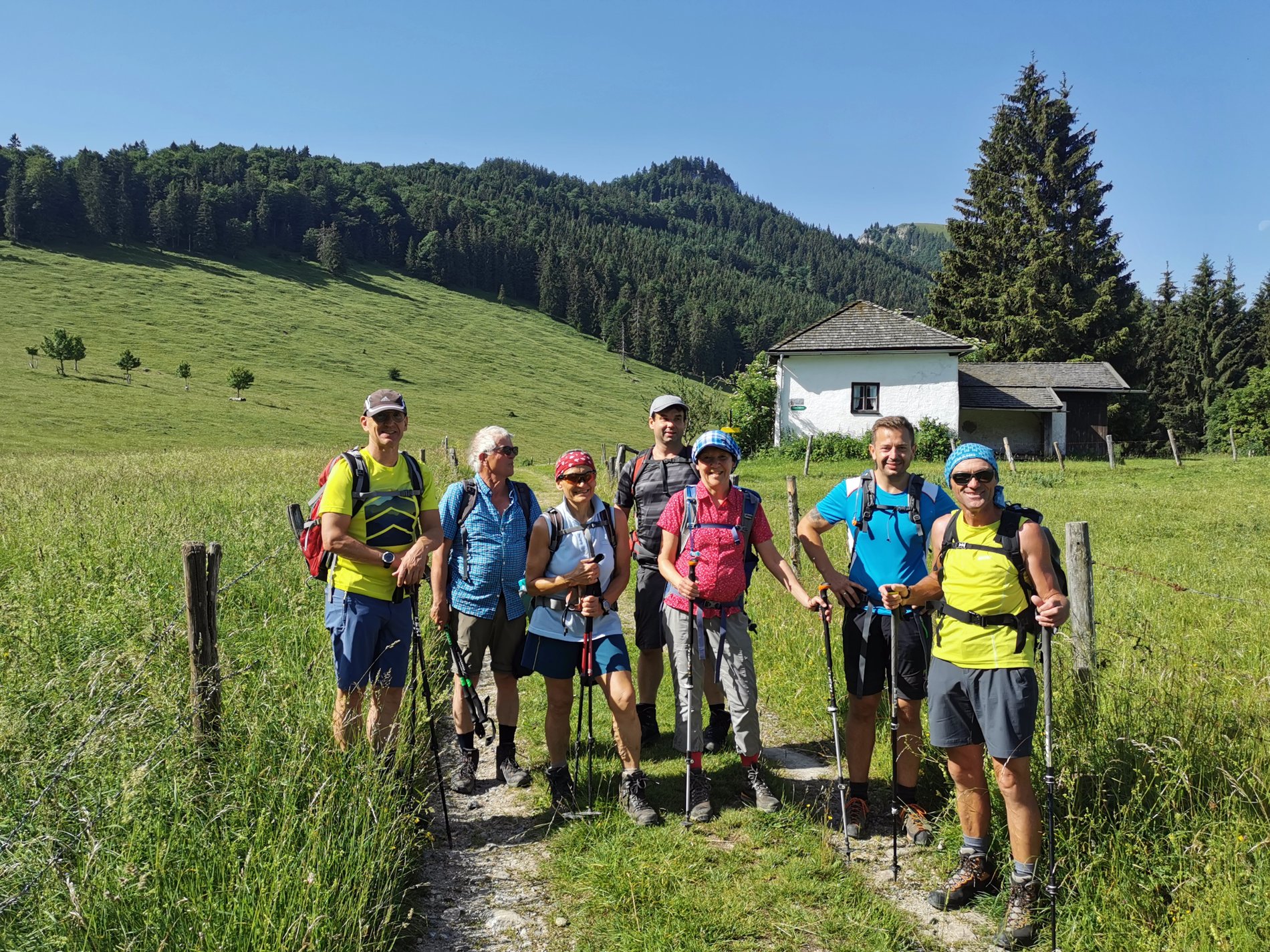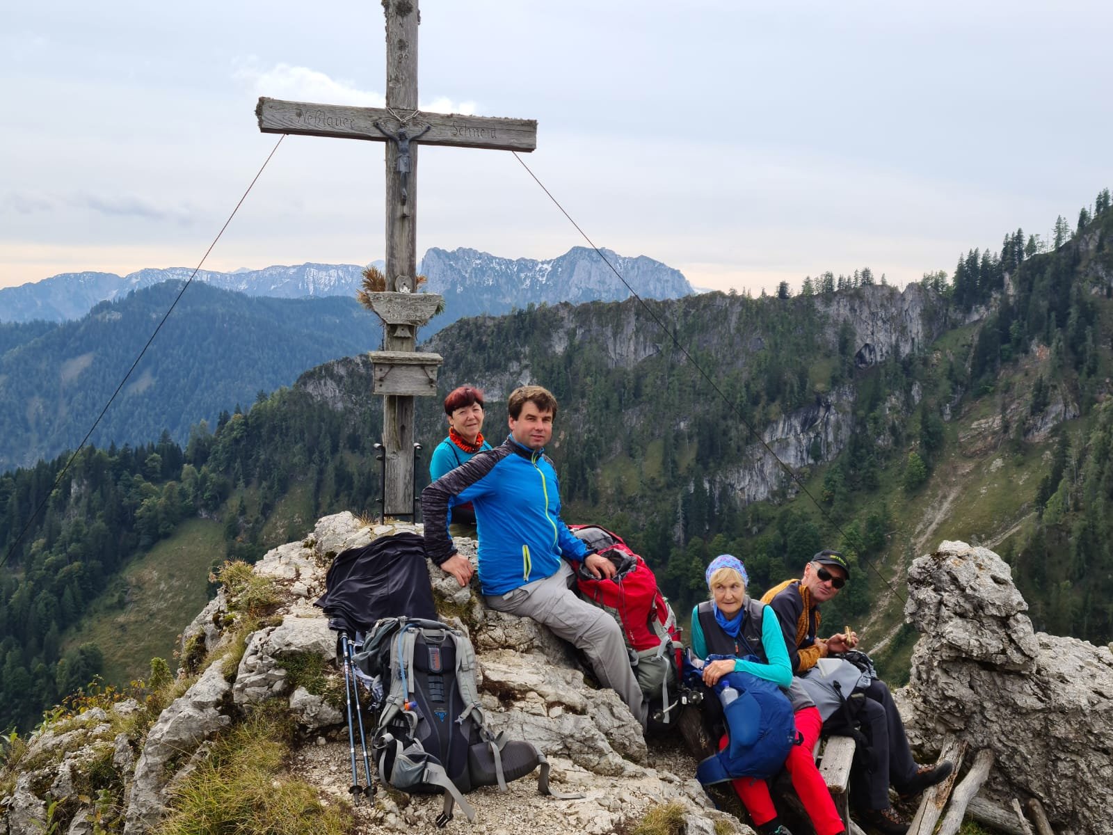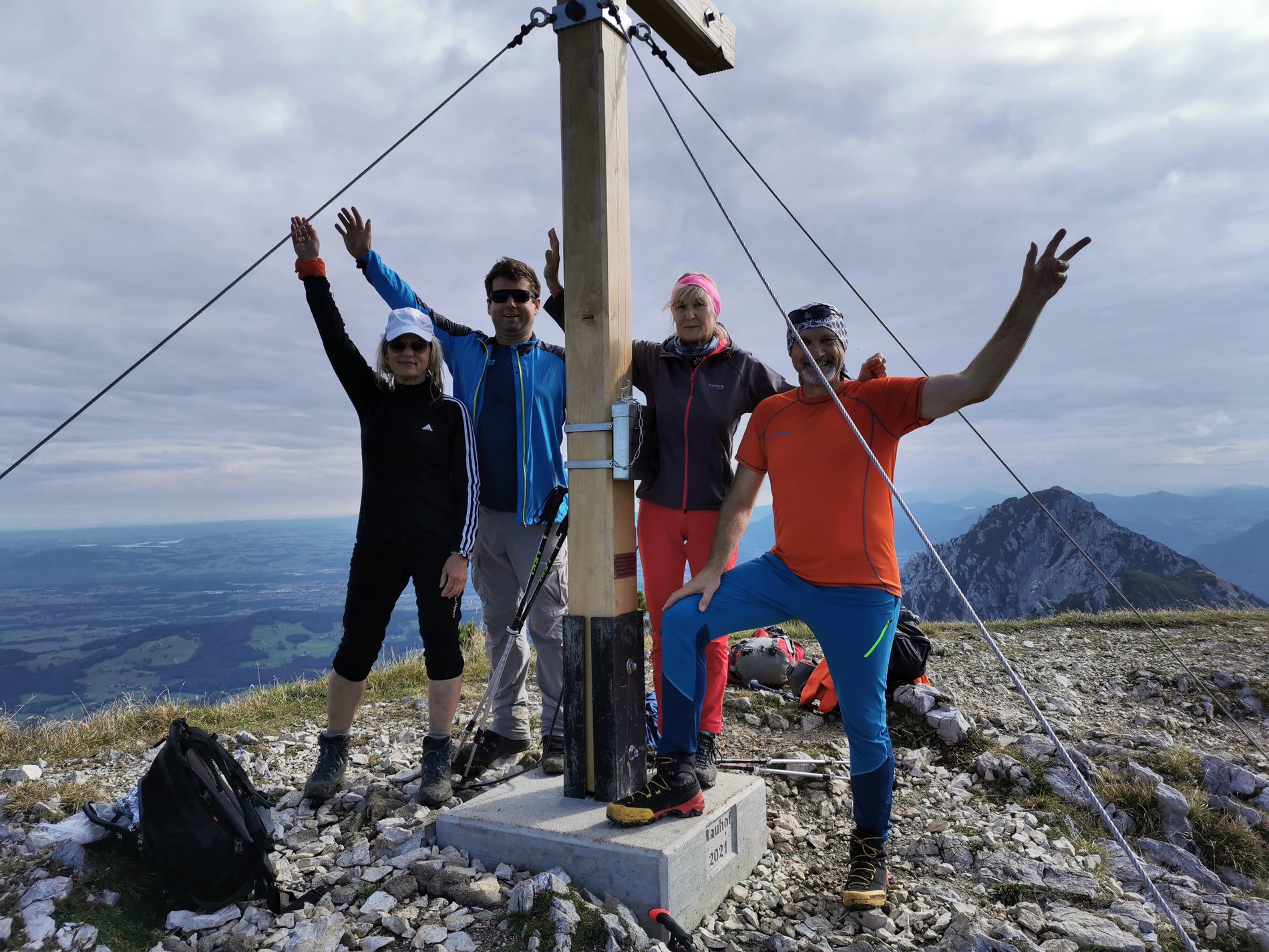 Leider sagte der Wettergott für unsere geplante Tour am Sonntag nichts Gutes voraus und so entschieden wir uns, die Tour auf Samstag zu verlegen. Wir wurden mit einem herrlichen Bergtag dafür belohnt. Ausgangspunkt der Tour war der Wanderparkplatz in Brand. Durch den Märchenwald ging es über einsame Pfade zur Nesslauer Schneid. Hier konnten wir den ausgesetzten Gipfel mit Bankerl bewundern und erobern. Nach einer kurzen Rast ging es weiter zum Gröhrkopf. Der letzte Abschnitt unserer Rundtour führte uns auf die Haaralmschneid. Über den gemütlichen Wanderweg schloss sich unsere Runde in Urschlau, dank Fahrrad im Gepäck. Auf dem Nachhauseweg kehrten wir im bekannten Café Schuhbeck ein, und konnten hier die Köstlichkeiten genießen.
