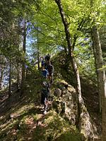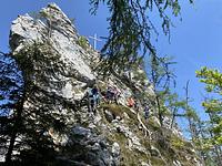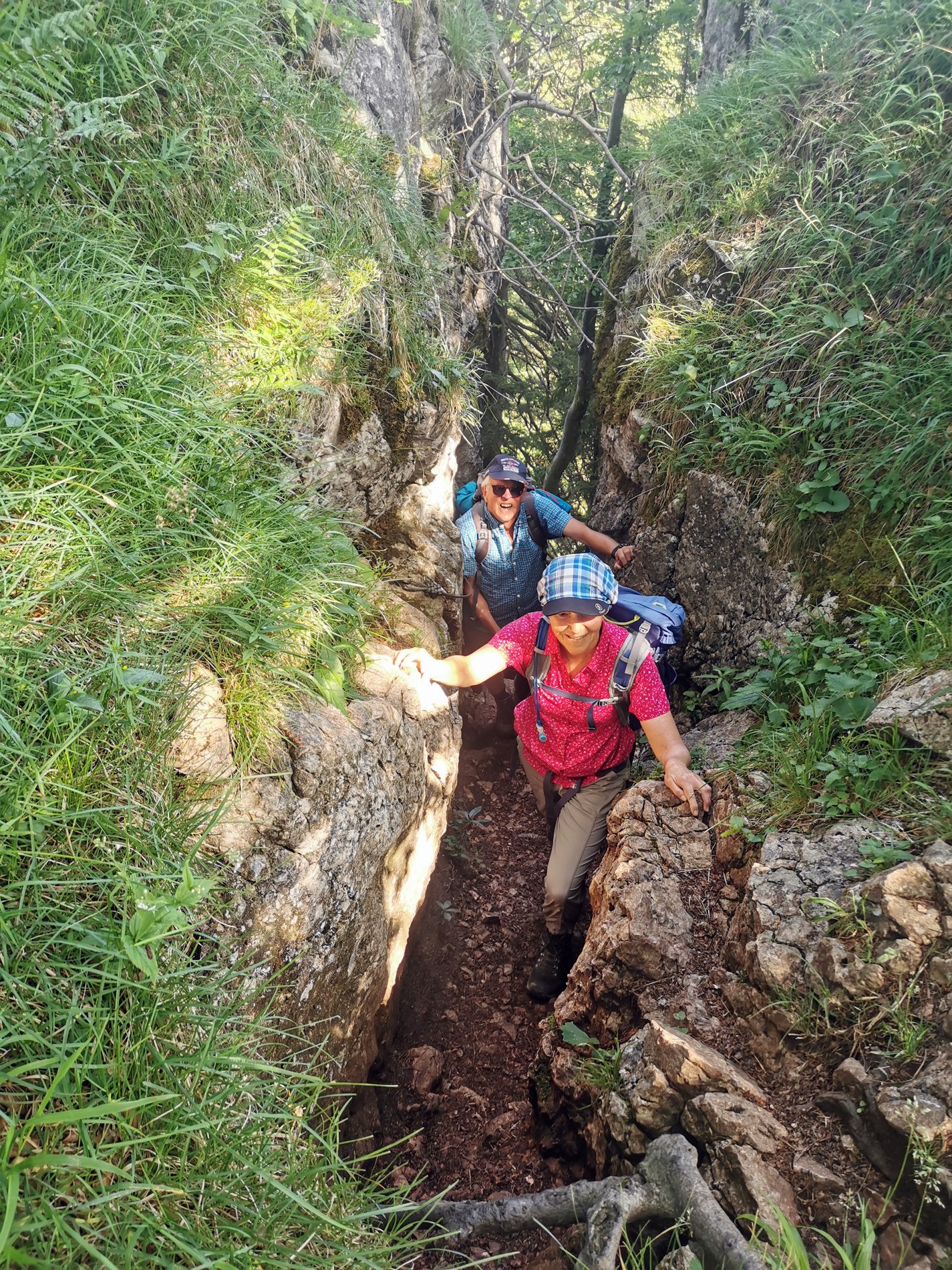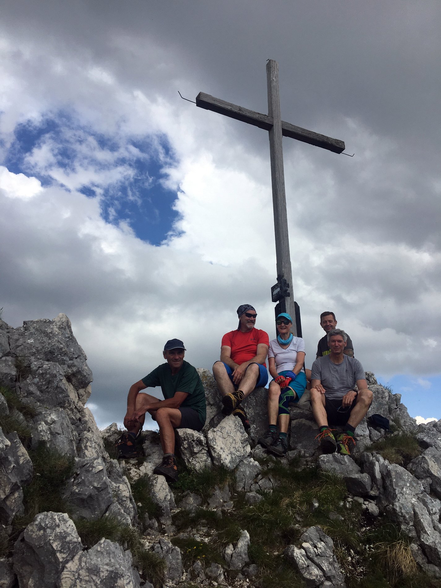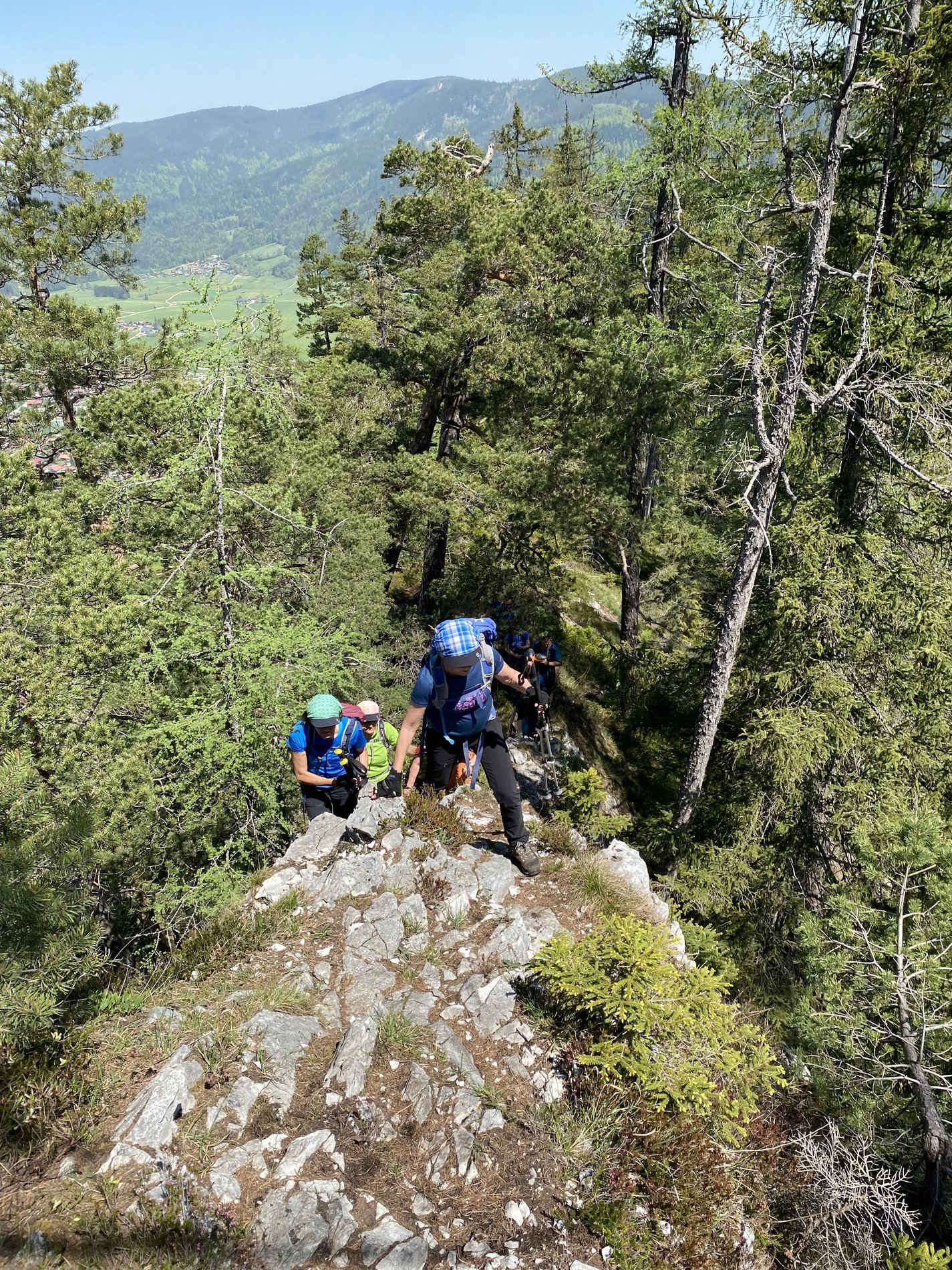 Start war am PP des Waldkindergartens Inzell, wobei die Tour alles andere als ein Kindergeburtstag werden sollte. Im hohen Gras, auf teils wenig erkennbarem Weg ging’s etwas ruppig bergan und über eine erste Drahtseileinlage in Richtung Nordgipfel. Souverän wurde eine zweite und dritte drahtseilversicherte Kletterei zum Klettergipfel von allen gemeistert, sodass eine erste Rast durchaus verdient war. Am etwas fordernden Abstieg um den Gipfel herum runter zum, diesen Gipfel auslassenden, Normalweg war nochmals Konzentration angesagt. Am breiten Grat, gewürzt mit kleineren schmalen Felseinlagen ging es im Auf und Ab Richtung Südgipfel und einer etwas ausgiebigeren Rast. Den üblichen Abstiegsweg auf halber Höhe verlassend und unter dem Grat entlang wanderten wir zurück zum PP, wo die Abstimmung über eine Einkehr im Forsthaus Adlgaß einstimmig ausfiel.