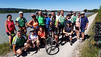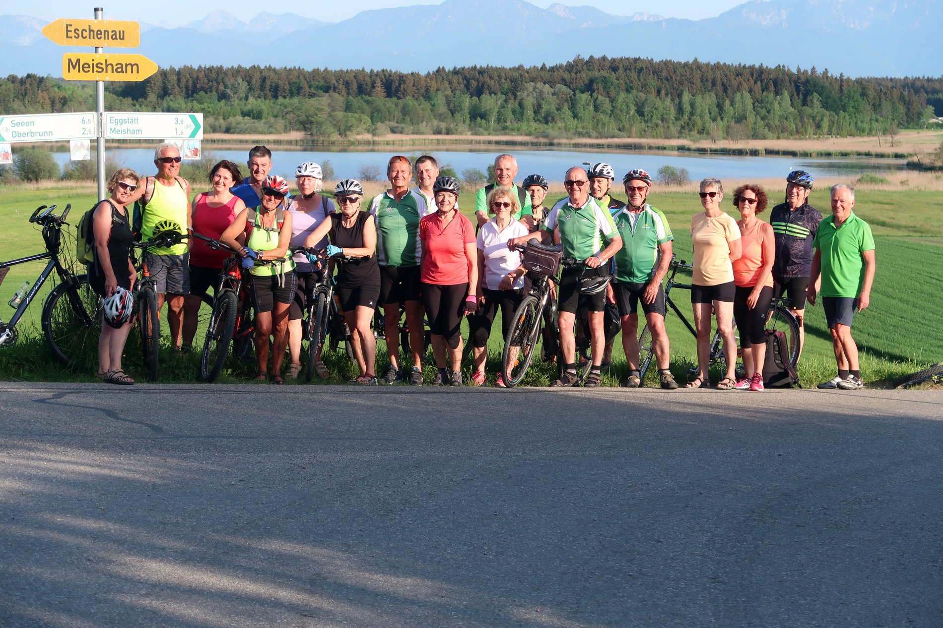 Die Seniorensektionstour mit dem Radl, die, wie es sich für echte Bergsteiger gehört, ohne Stromradl erfolgte, führte in die von eiszeitlichen Gletschern geformte und wasserreiche Hügellandschaft zwischen der Eggstätter Seenplatte und dem Simssee nahe Rosenheim. Die 21 Teilnehmer starteten bei besten Wetterbedingungen beim Kloster Seeon. Auf meist ruhigen Radwegen, die Chiemgauer Berge mit Kampenwand und dem Mangfallgebirge mit dem Wendelstein vor Augen, ging es Richtung Simssee. Einen herrlichen Panoramablick gewährte die Terrasse eines Lokals in Höslwang bevor es nach Bad Endorf und dann entlang des Nordwestufers des Simsees nach Stephanskirchen ging. Dort lud ein schattiger Gastgarten an diesem sehr warmen Tag die Seniorensportler zum Mittagessen ein. Nach fast vollständiger Umrundung des 14 Kilometer umfassenden Sees wurde die Eggstätter Seenplatte angesteuert. Es ging munter bergauf und bergab bis zur Durchquerung des Eggstätter Seengebietes auf Waldwegen und dem Badestopp am Hartsee mit Einkehr im Garten des Hartsee-Stüberls. Nach 71 Kilometern und 770 überwundenen Höhenmetern war der Parkplatz unfallfrei wieder erreicht.