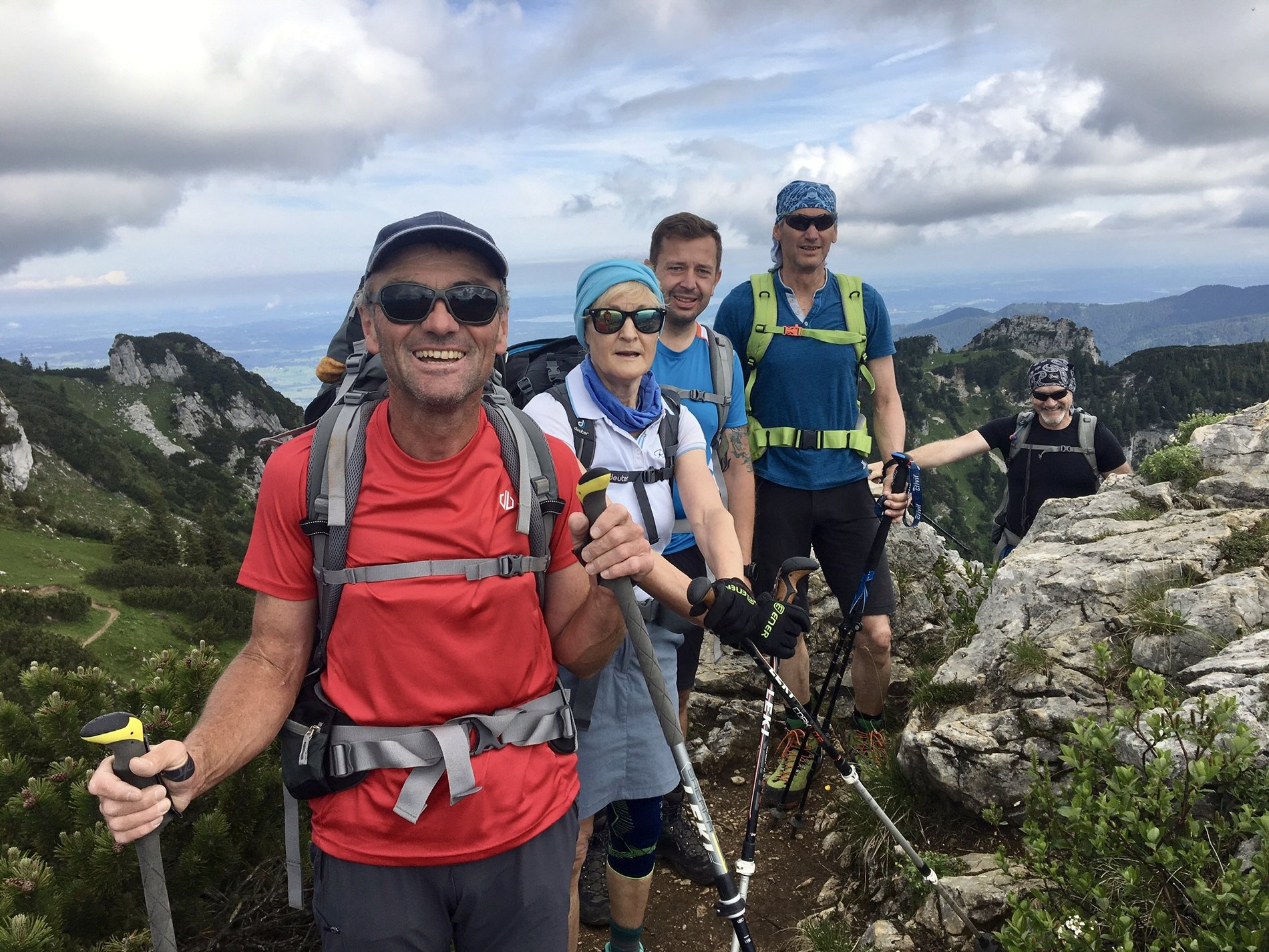 Unser Quartier für die drei ausgefüllten Wandertage war die Tutzinger Hütte in den bayerischen Voralpen. Wir haben uns dort sehr wohl gefühlt. Als Anstieg für den ersten Tag haben wir den Altweibersteig über die Bichleralm gewählt. Eine Zwischenstärkung in der Alm hat den Anstieg über knapp 1 100 Hm erleichtert. Nach einer Gipfelbrotzeit auf der Benediktenwand nutzten wir das schöne Wetter noch für eine einsame Runde über die Probstenalm und das Henerköpfe. Den anspruchsvollen Gipfelaufstieg haben alle gut gemeistert. Nach dieser langen Tour waren wir froh, als wir an der Hütte angekommen sind.