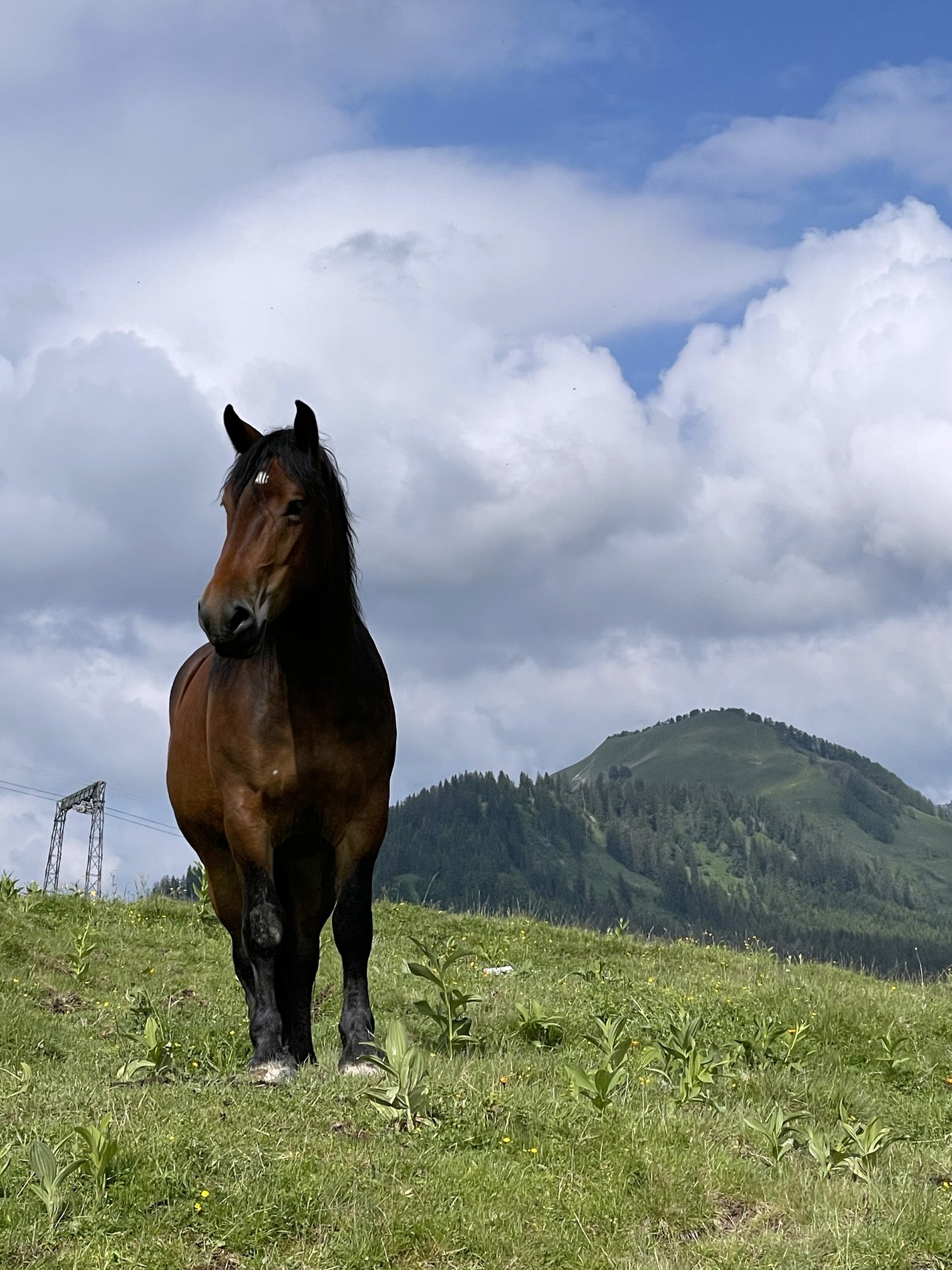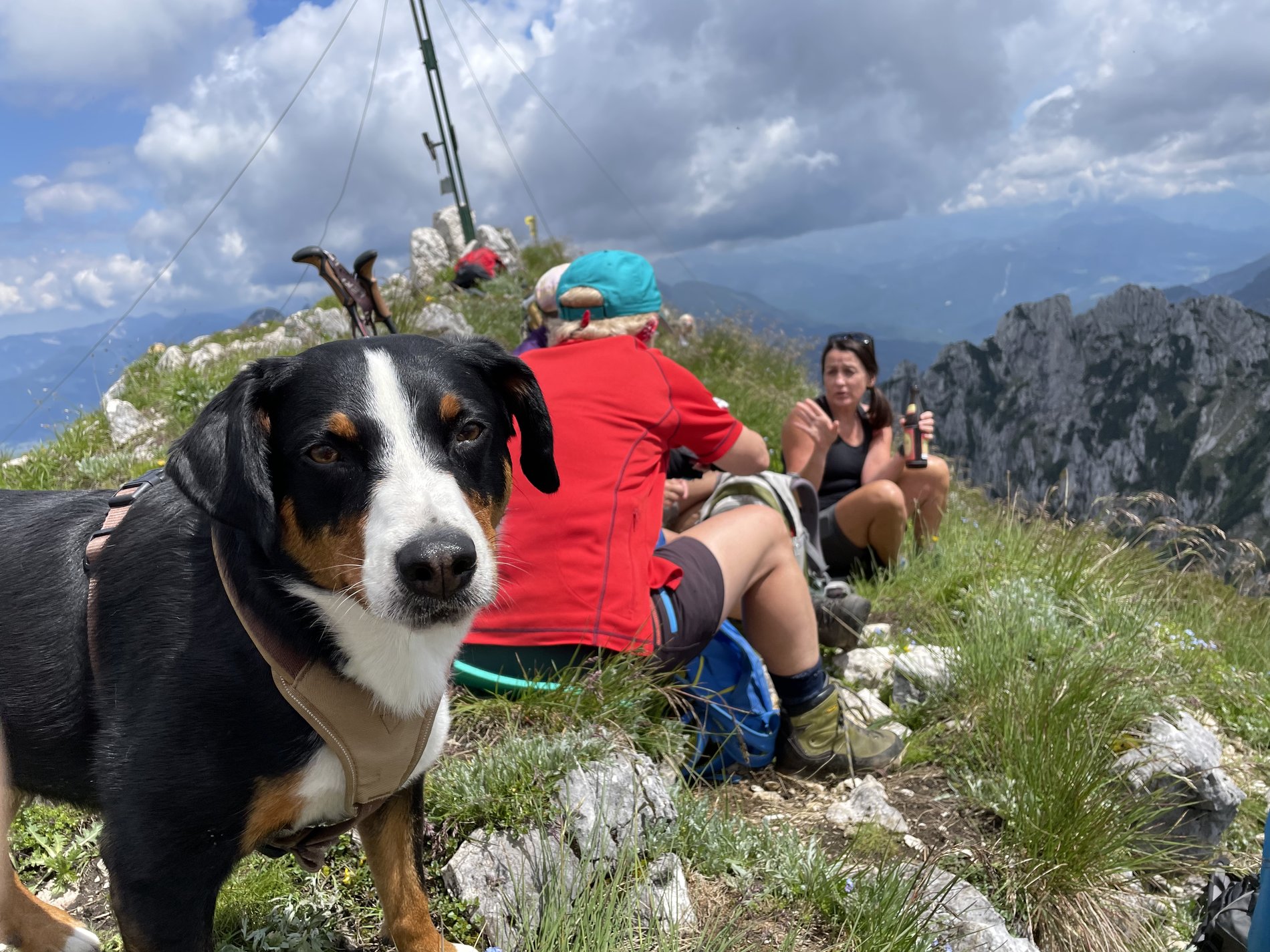Die Premiere für Daniela als Tourenleiterin startete am Parkplatz der Postalm (Gebiet Wolfgangsee). Den zwei- und vierbeinigen Teilnehmer/innen begegneten im Aufstieg auf grünen Wiesen friedlich grasende und dösende Stuten mit ihren Fohlen, die die Sonnenstrahlen sichtlich genossen. Vorbei an der Rettenegghütte gings zielstrebig Richtung Braunedlkogel, den wir nur mit wenigen Wanderern teilen mussten. Unter blauem Himmel mit weißen Wolken konnten wir direkt am Gipfelkreuz eine schöne Brotzeit machen.