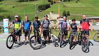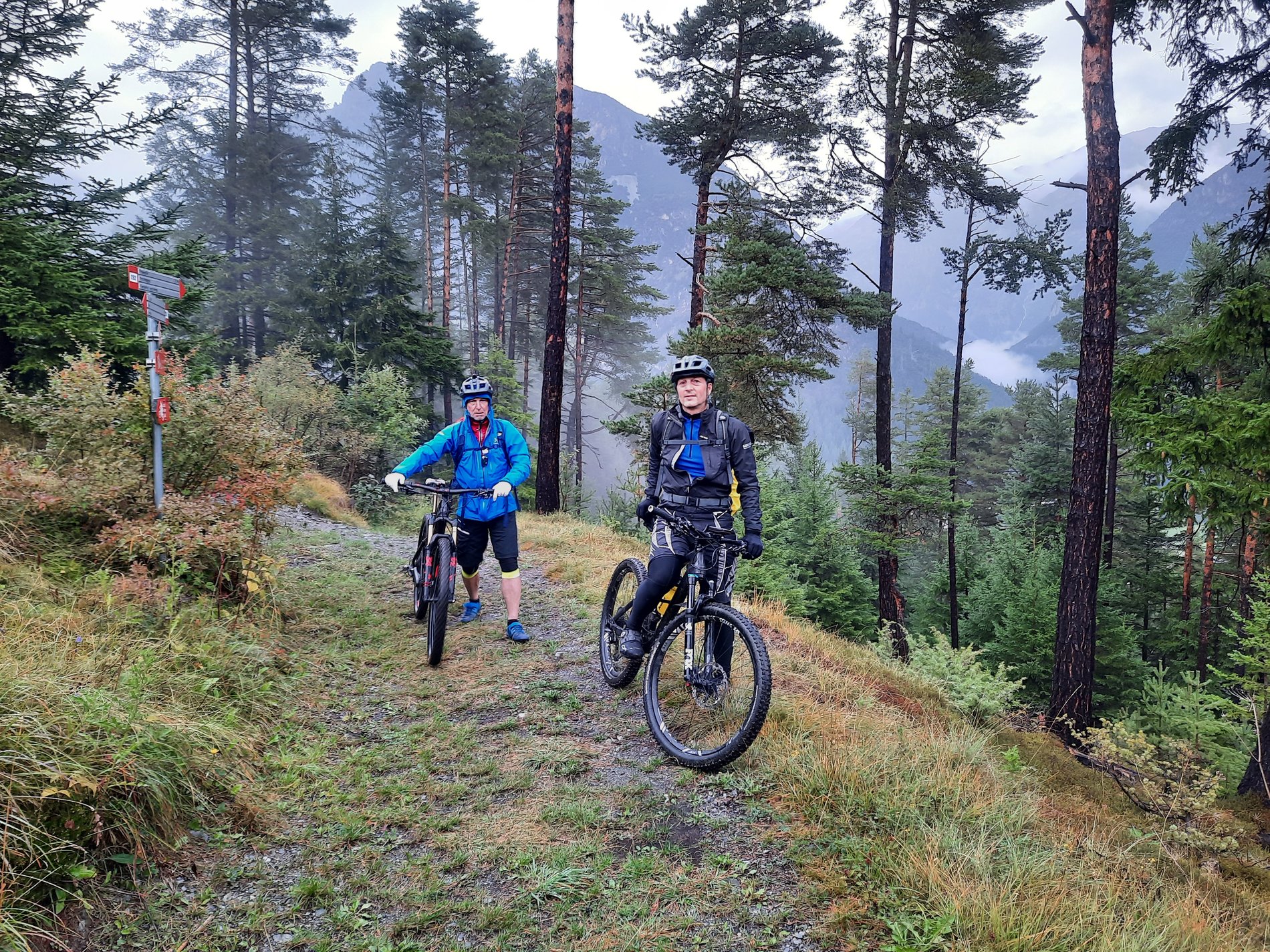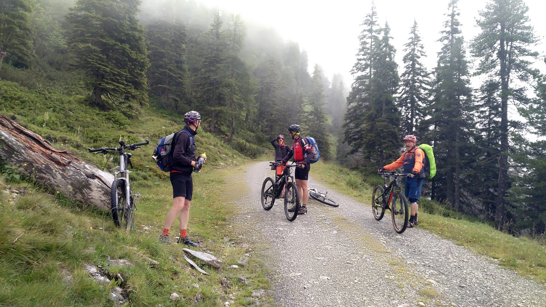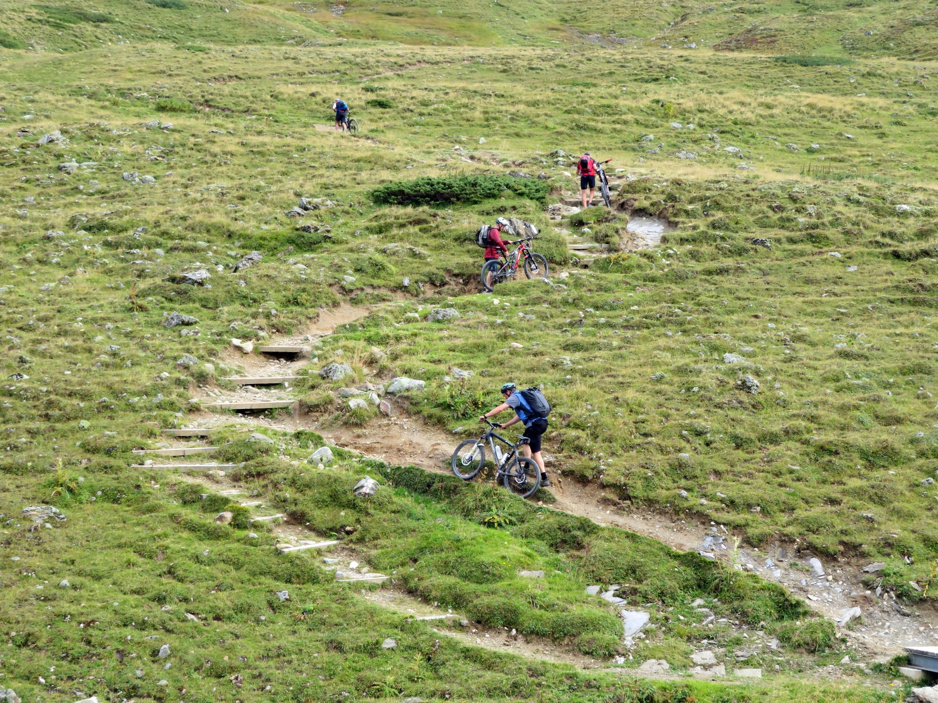 Nach dem kurzen, aber steilen Anstieg gleich nach Ischgl fuhren wir bei mäßiger Steigung auf dem Fahrweg bis zur Heidelberger Hütte. Nach der Kaffee- bzw. Brotzeitpause hieß es erstmal schieben, denn der 350 Hm lange Anstieg zum Fimberpaß (2608 m) war nur auf kurzen Abschnitten fahrbar. 1500 Hm waren’s noch zum Ziel in Scuol, nur bergab auf nicht ganz einfachem Trail. Und der Gewitterschauer mit Schneeboisl machte es nicht einfacher.