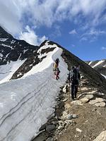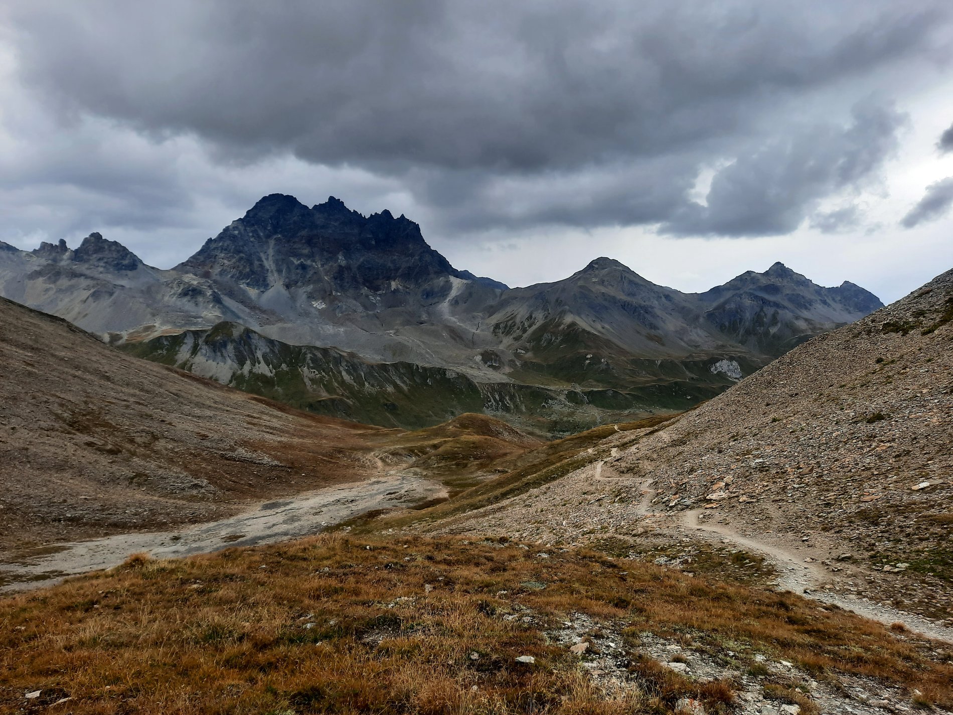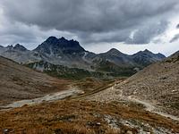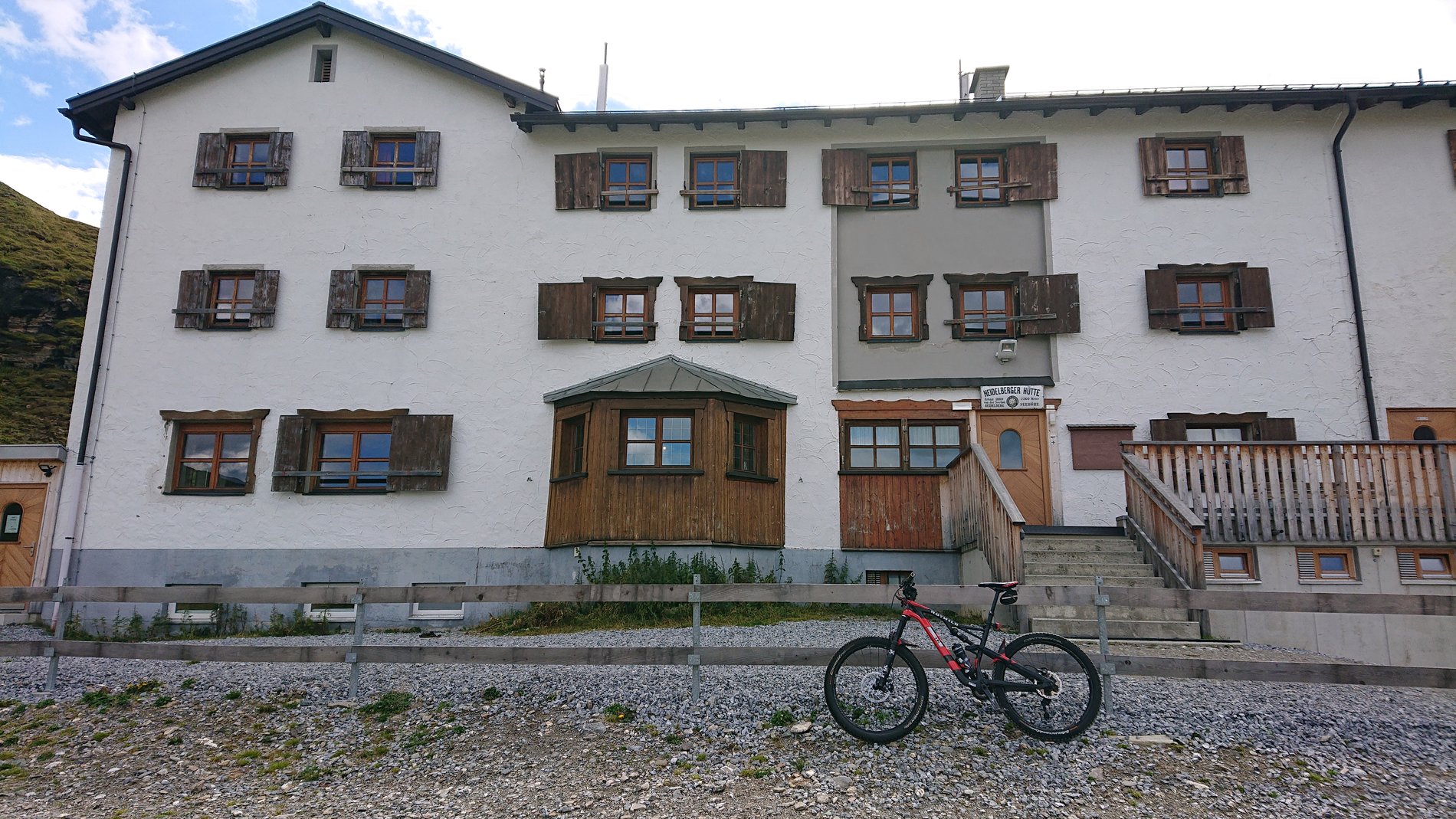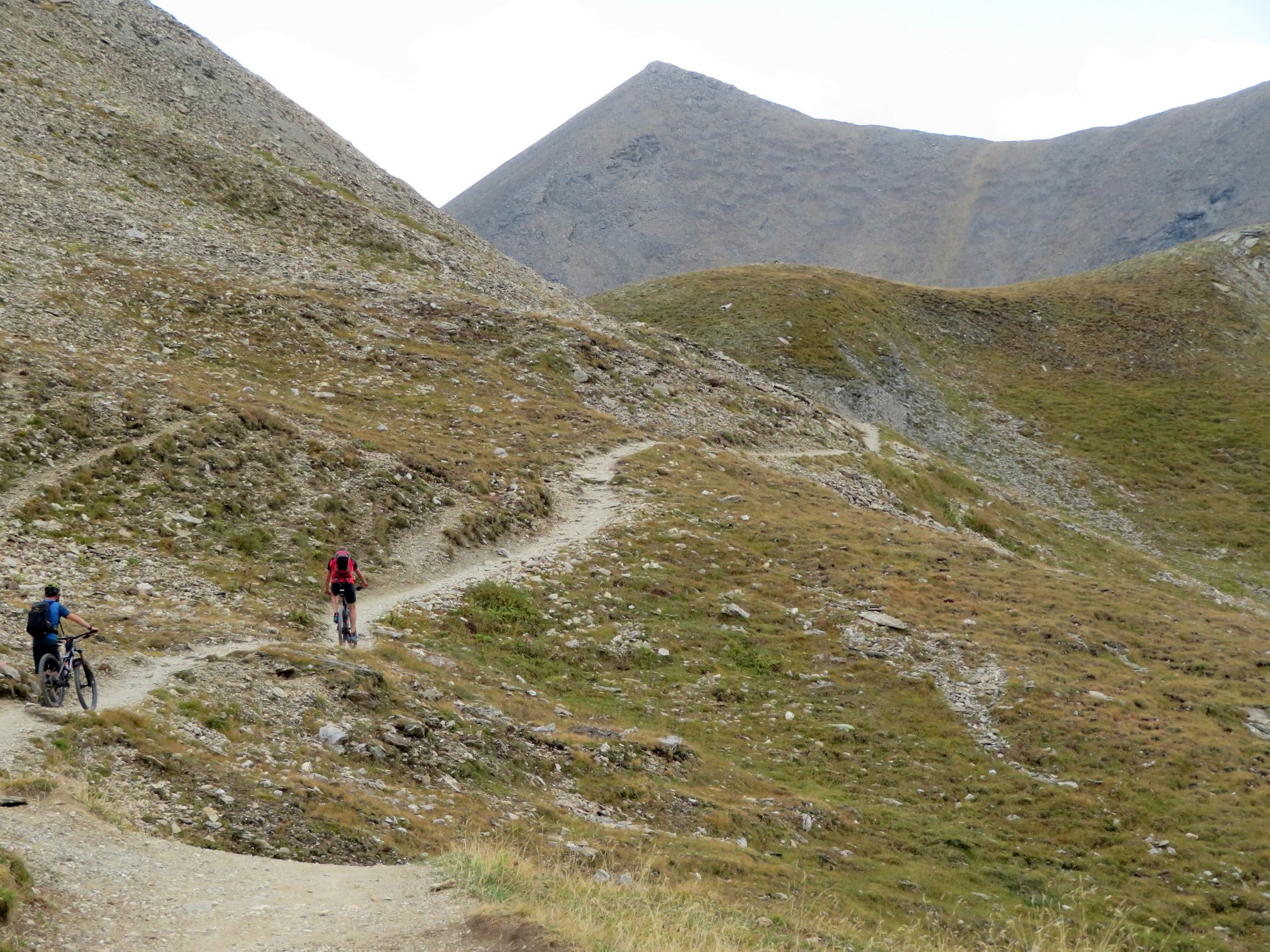 Nach dem kurzen, aber steilen Anstieg gleich nach Ischgl fuhren wir bei mäßiger Steigung auf dem Fahrweg bis zur Heidelberger Hütte. Nach der Kaffee- bzw. Brotzeitpause hieß es erstmal schieben, denn der 350 Hm lange Anstieg zum Fimberpaß (2608 m) war nur auf kurzen Abschnitten fahrbar. 1500 Hm waren’s noch zum Ziel in Scuol, nur bergab auf nicht ganz einfachem Trail. Und der Gewitterschauer mit Schneeboisl machte es nicht einfacher.