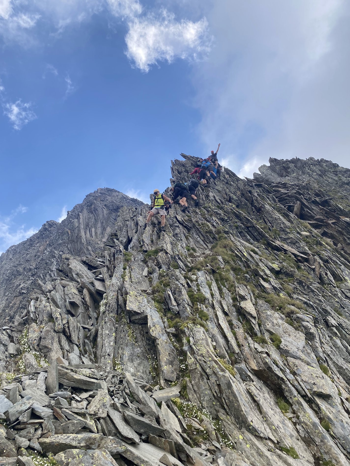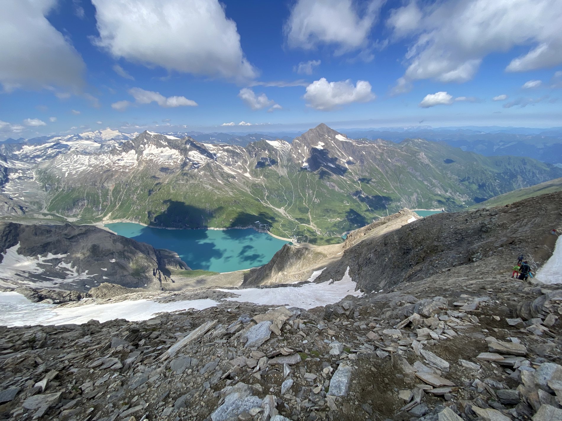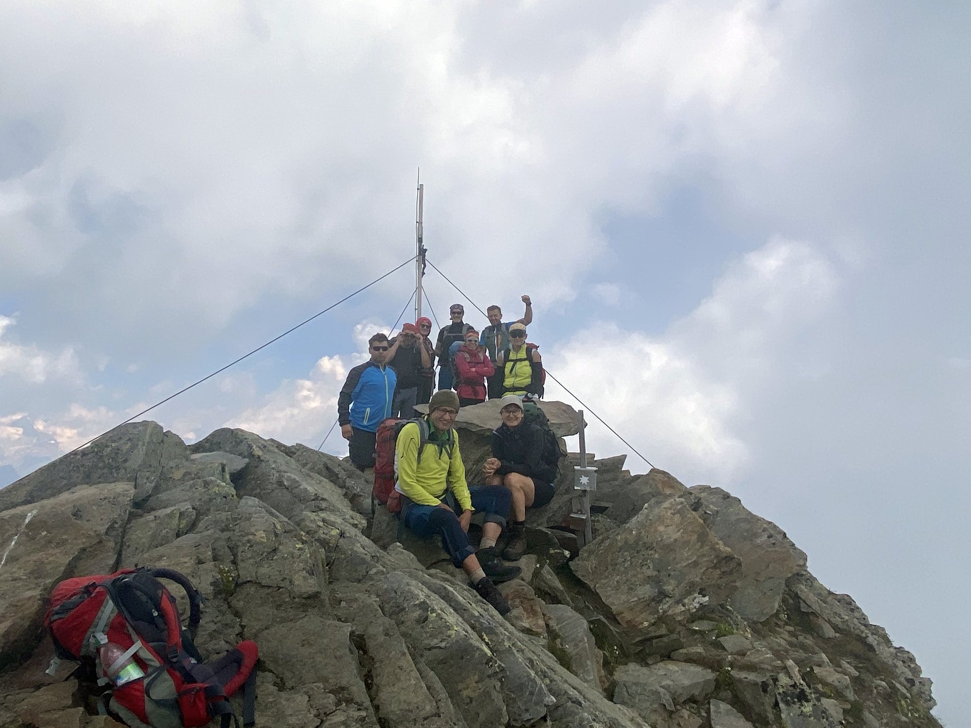 Waren wir auf der Zupalseehütte noch auf einige andere Bergbegeisterte gestoßen, war uns am nächsten Tag ein einsamer Gipfeltag am Lasörling, der für zwei Teilnehmer den ersten 3000er darstellte, vergönnt. Die Freude darüber, dass wir den Berg quasi für uns hatten, wurde – im wahrsten Sinne des Wortes – etwas getrübt durch nebeliges Wetter und wenig Gipfelsicht. Der Abstieg führte über den versicherten Westgrat und die steile, steinschlaggefährdete Nordwest-Flanke – glücklicherweise ohne Zwischenfall. Weiter marschierten wir über den Muhs-Panorama-Weg, der seinem Namen gerecht wurde, sich aber auch lang zog und das ein oder andere „Murren“ in der Gruppe verursachte. Den Weg teilten wir uns mit den ersten anderen Wanderern an diesem Tag. Darüber, dass sich die Mühen gelohnt hatten, waren sich alle einig, als wir die wunderschön gelegene und urige Bergerseehütte erreichten, wobei wir uns im Wasser (mit einem überdimensional großem Plastik-Flamingo, der für Erheiterung sorgte) tierisch entspannen konnten. Im Anschluss verbrachten wir einen schönen Hüttenabend und kehrten im Panoramalager zur Nachtruhe ein.