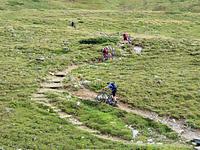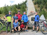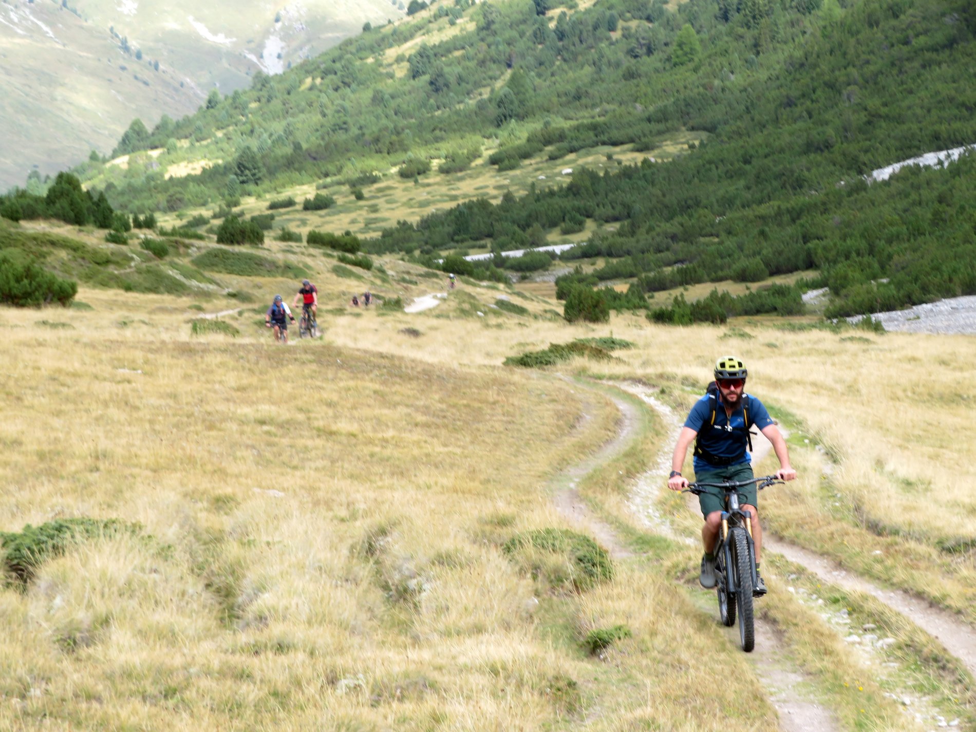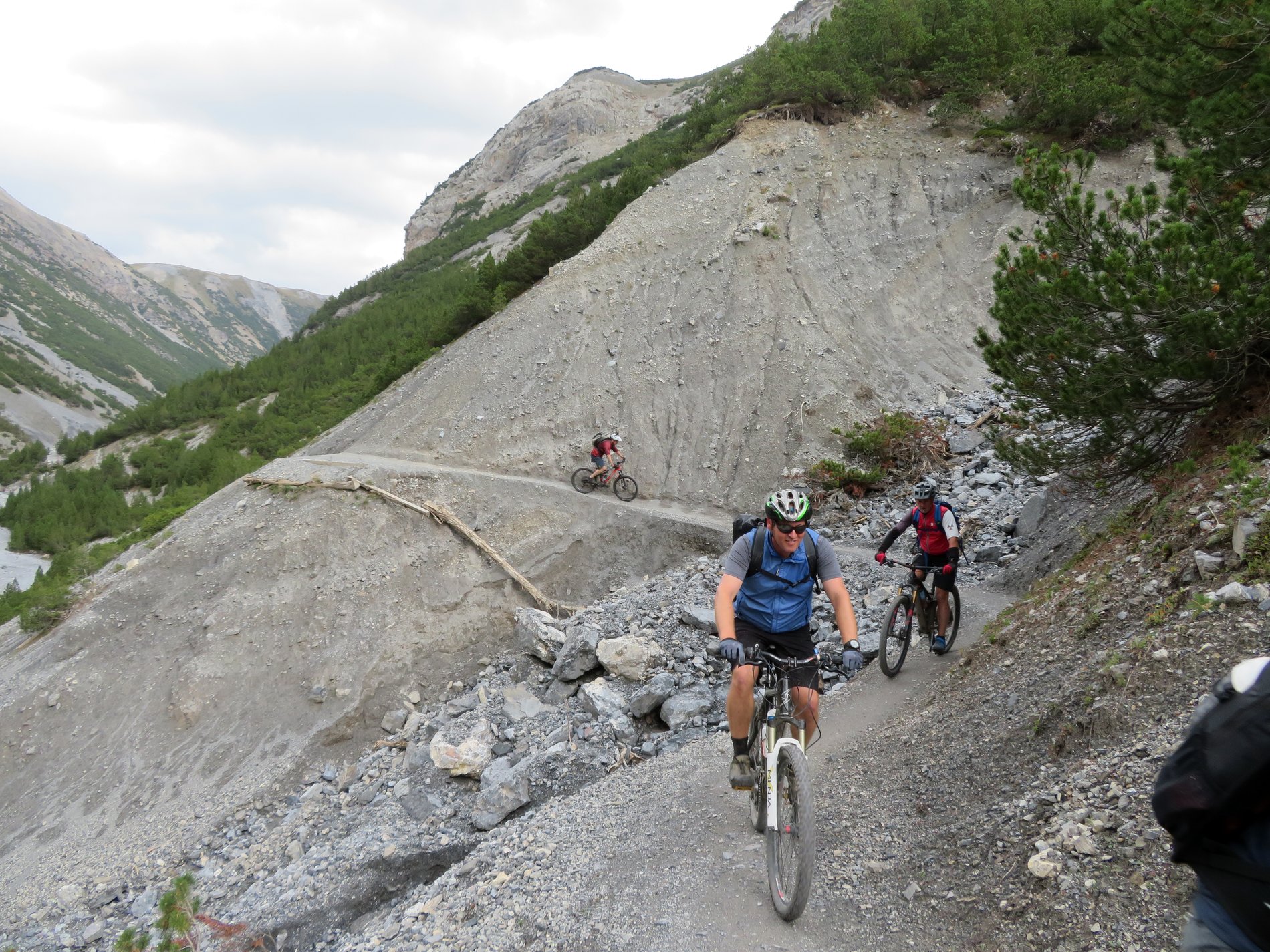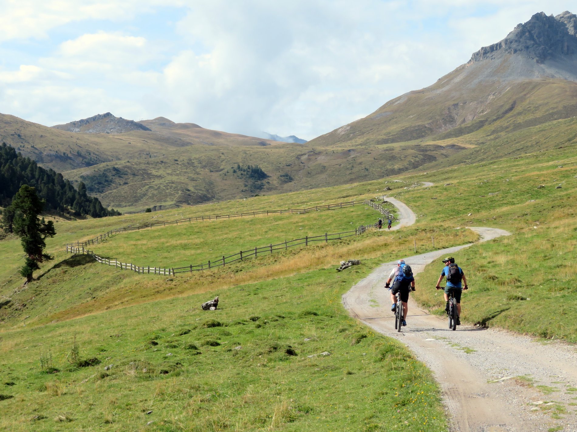 Nach dem Überqueren des Inns folgte am zweiten Tag der lange Anstieg durch das Tal S-charl. Nachdem uns ein Postbus mit Mountainbikes auf dem Heckträger überholte, brauchten wir nicht länger zu rätseln, wie manche Helden enorme Tagesetappen schafften. Ab der Alp Astras wurde es anspruchsvoll, auf schwierigen Trails erreichten wir passend zur Mittagszeit den Ofenpaß (2149 m). Die weitere Route führte uns über Buffalora am Piz Daint vorbei ins Val Mora und weiter im engen Bachtal bis zu den Stauseen Lago di San Giacomo und Lago di Cancano, wo wir das zweite mal übernachteten. Die Zimmerlager waren zwar einfach, das italienische Abendessen mit mehreren Gängen dafür umso besser.