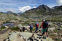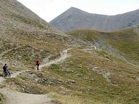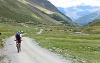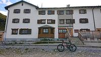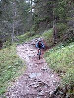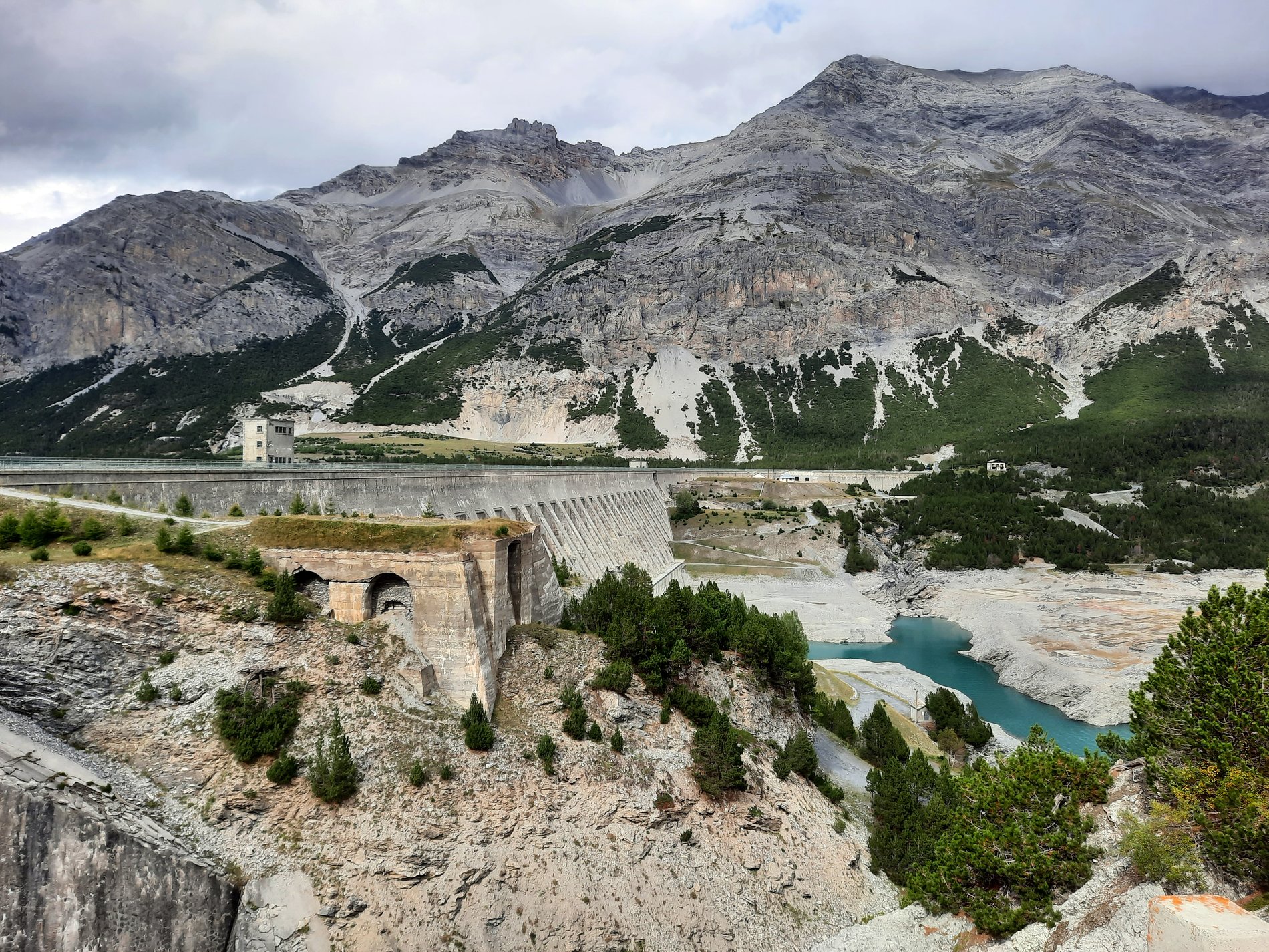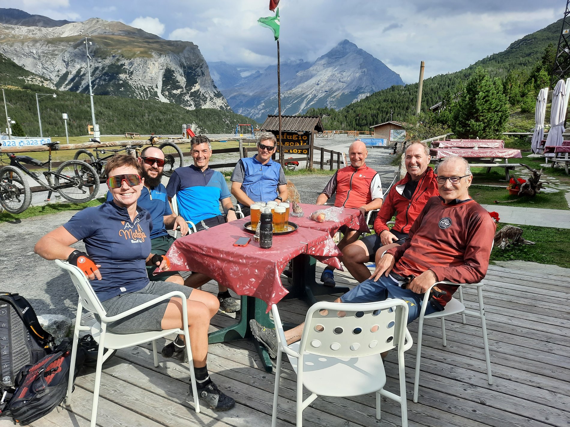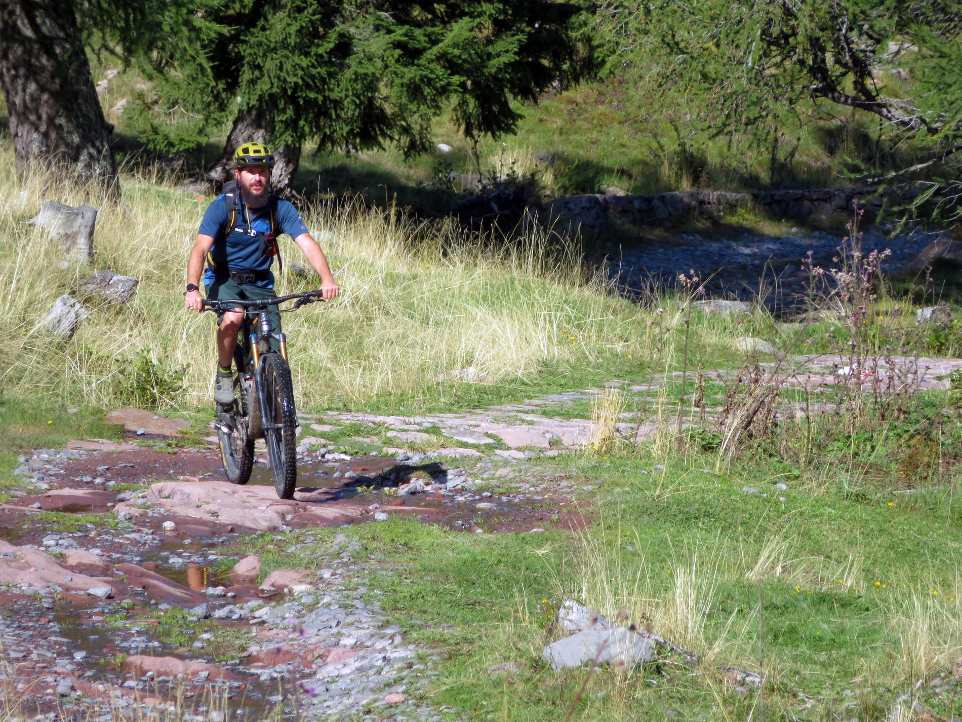 Nach dem Überqueren des Inns folgte am zweiten Tag der lange Anstieg durch das Tal S-charl. Nachdem uns ein Postbus mit Mountainbikes auf dem Heckträger überholte, brauchten wir nicht länger zu rätseln, wie manche Helden enorme Tagesetappen schafften. Ab der Alp Astras wurde es anspruchsvoll, auf schwierigen Trails erreichten wir passend zur Mittagszeit den Ofenpaß (2149 m). Die weitere Route führte uns über Buffalora am Piz Daint vorbei ins Val Mora und weiter im engen Bachtal bis zu den Stauseen Lago di San Giacomo und Lago di Cancano, wo wir das zweite mal übernachteten. Die Zimmerlager waren zwar einfach, das italienische Abendessen mit mehreren Gängen dafür umso besser.