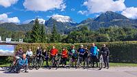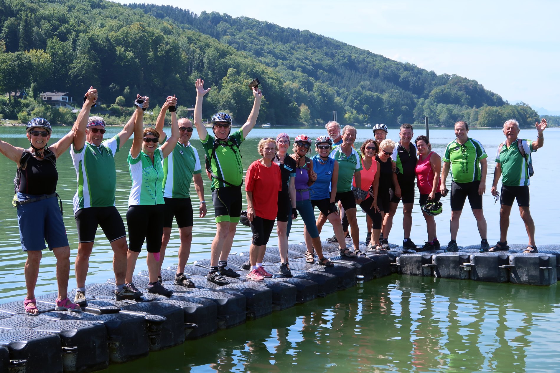 Die Seniorenradtouren des Alpenvereins erfreuen sich großer Beliebtheit. Für die Fahrt in das Salzburger Seenland gab es 17 Anmeldungen beim Tourenleiter. Der Vereinsbus und vier Autos brachten die fast ausschließlich stromlos fahrenden Teilnehmer zum Ausgangspunkt nach Bergheim bei Salzburg. Zuerst entlang des Alterbaches und dann acht Kilometer auf der ansteigenden ehemaligen Trasse der Ischlerbahn bis Eugendorf wurde Seekirchen am Wallersee angesteuert. Von dort führte die Route längs des malerischen Ostufers nach Köstendorf zur Mittagspause. Bergig war der Weg bis Schleedorf, aber ab dem Naturschutzgebiet Egelseen bis Mattsee gingen die mühsam erklommenen Höhenmeter wieder verloren. Das Seebad in Obertrum brachte die nötige Erfrischung, äußerlich und innerlich, an diesem sonnigen und heißen Tag. Das war auch gut so, denn es wartete noch ein Anstieg von rund 100 Höhenmetern zum Luginger See, der in einem Landschaftsschutzgebiet liegt. Von dort oben hatte man einen fantastischen Blick auf die Salzburger und Berchtesgadener Berge und die beginnende Abendstimmung tat ihr übriges. Von nun an brauchte man gute Bremsen hinunter zum Fischach-Bach und über einen schmalen, romantischen Pfad war bald der Parkplatz nach 80 Kilometern Fahrstrecke bei Überwindung von 850 Höhenmetern erreicht.