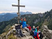Bis zur Ankunft Parkplatz Rosengassen Hütte regnete es, aber pünktlich zum Abmarsch hörte es auf und die Sonne ließ sich blicken. Der Nordwestanstieg hatte sehr schmierige Passagen und verlangte volle Aufmerksamkeit. Nach 2½ Stunden waren wir am großen Traithen und ab jetzt begann der schönste Teil der Rundtour. Die Überschreitung zum Untersberger Joch und Steintraithen fand großen Anklang bei den 14 Teilnehmern. Der Abstieg über die Nordflanke mit glatten und rutschigen Stellen wurden bis auf einige Ausrutscher gut gemeistert. Auf der urigen Speckalm endete der Bergtag bei bester Stimmung mit Blick zum Wendelstein im Abendlicht.