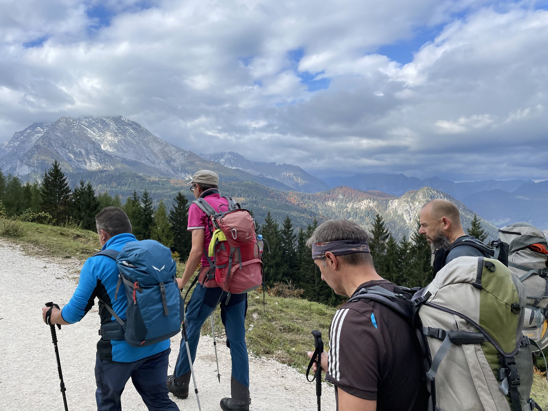 Der teilweise felsdurchsetzte Weg forderte in Aufstieg und später auch im Abstieg unsere Aufmerksamkeit. Im Gipfelbereich trafen wir auch schon oder noch auf Schnee. Für kurze Momente konnten wir sogar etwas Aussicht auf einige Berchtesgadener Gipfel erhaschen. Bei der Hütte angekommen, wurden auch wir „einegspuit“ und wir freuten uns auf einen zünftigen Hüttenabend.